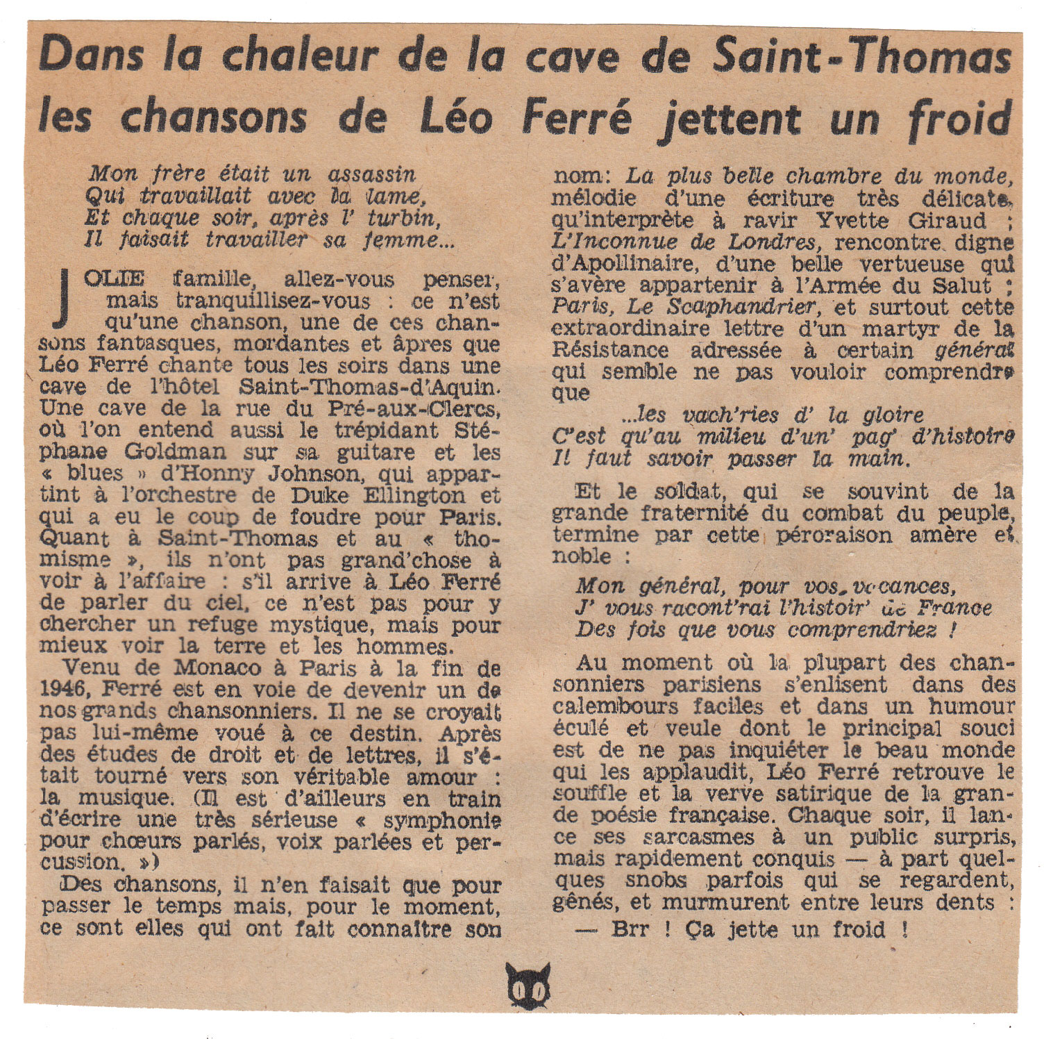 L’un des premiers artistes qui montèrent sur la scène improvisée du « Quod Libet », fut un inconnu pauvre, très pauvre, anarchiste farouche, qui, rentrant d’une tournée de six mois en Martinique où il n’avait touché que 22 cachets misérables, couchait dans un hôtel miteux et mangeait de temps en temps. Il s’appelait Léo Ferré.