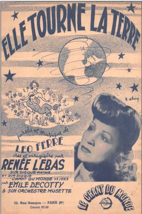 Renée Lebas : Sa première interprète. J’ai chanté « Elle tourne et se nomme la terre » dans un spectacle à l’ABC, en 1947-48, où Mitty Goldin, qui semblait m’aimer beaucoup, m’avait engagé pour mon premier contrat. C’est la première fois que Léo Ferré était chanté sur scène.