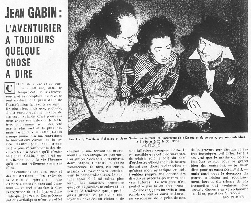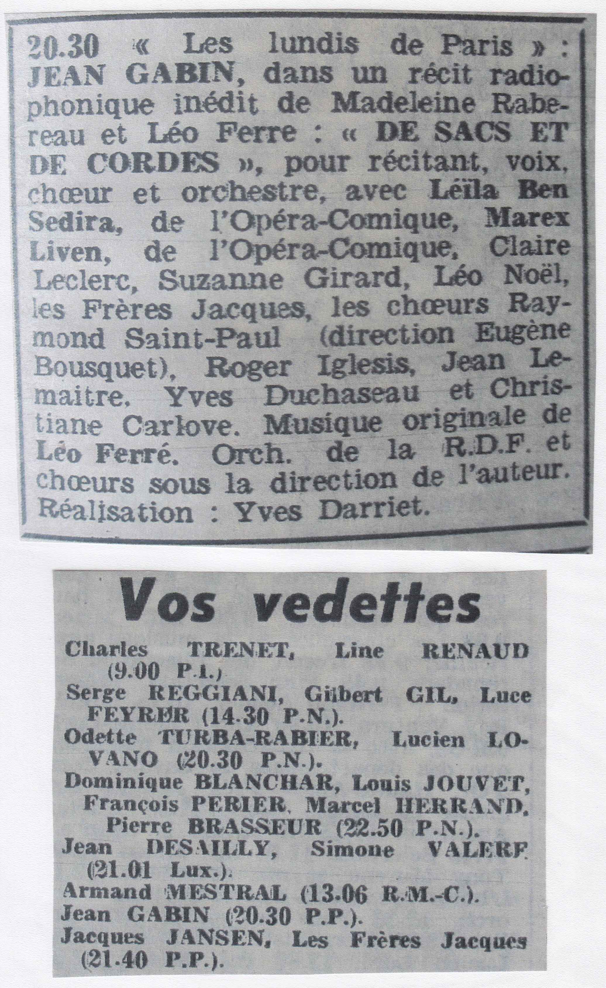 05.02 : Première diffusion à la Radio Nationale, une émission avec Jean Gabin intitulée De sacs et de cordes, qui a été enregistré le 12 janvier 1951 aux studios de la RTF, Paris (France).