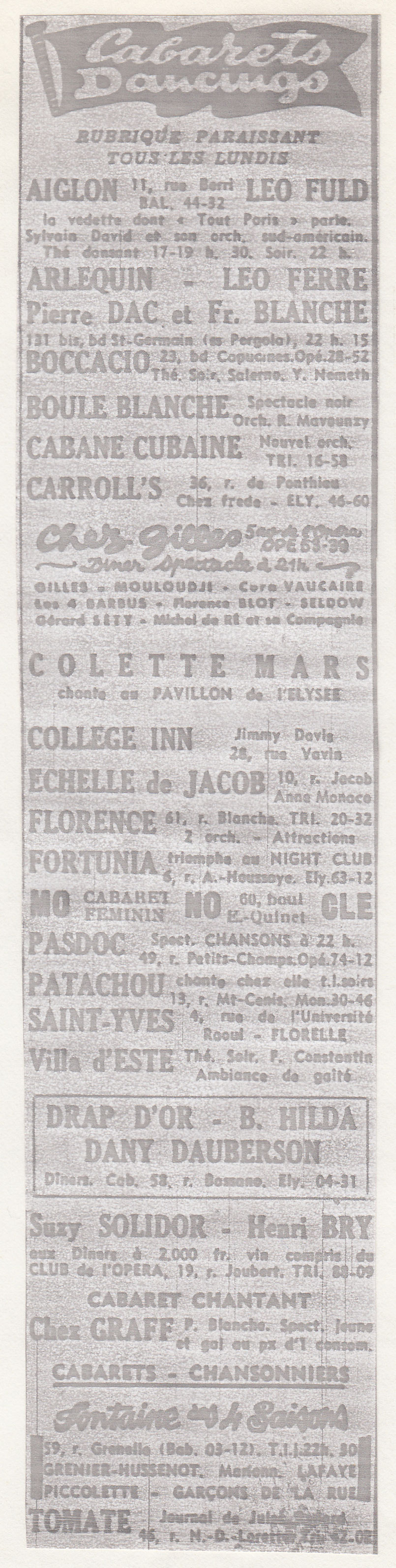 Au premier étage, une porte sur laquelle est punaisée la photographie des saint-bernard Arkel, Canaille et Egmont. Plus tard, la porte sera parfois ouverte par Pépée, chimpanzé femelle. On est chez Léo Ferré, que le Bottin signale comme compositeur de musique.