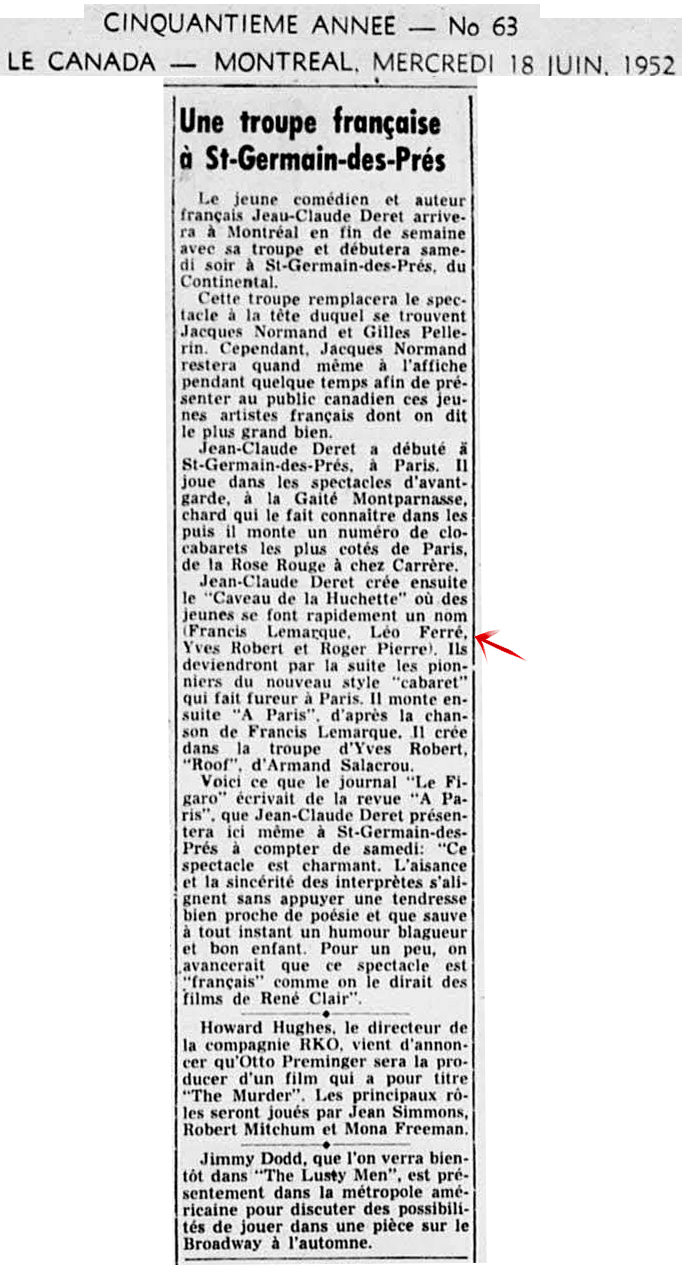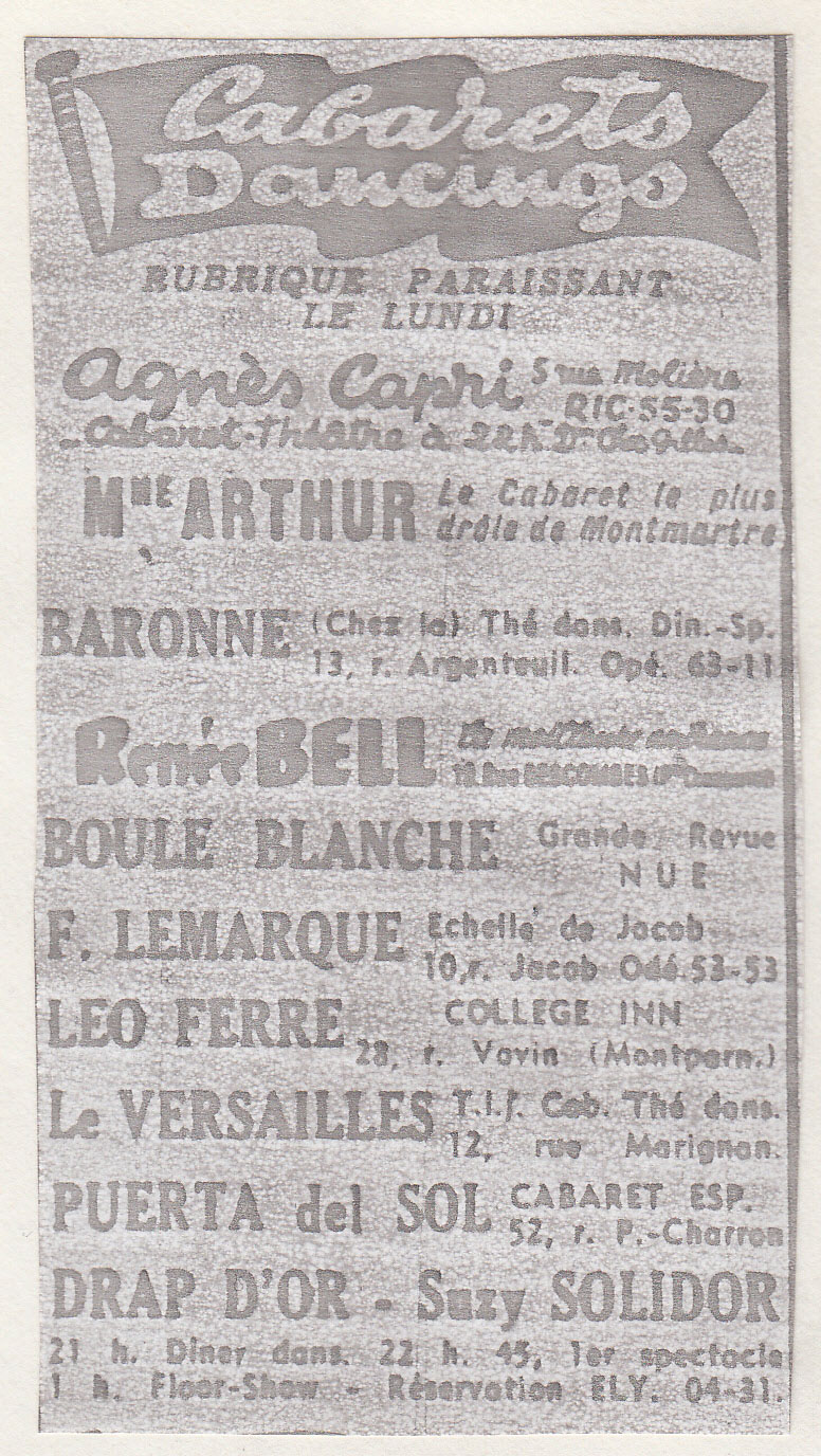 Léo, personnage insolite et multiple, était venu me voir après la sortie de Paris Canaille… Il était accompagné de Catherine Sauvage et de son ex-femme Madeleine, et voulait me montrer ses nouvelles chansons destinées au disque suivant, notamment L’homme. Après le départ de Catherine une discussion s’engagea. Léo voulait à tout prix faire les arrangements de ce disque. Pour moi, il ne pouvait en être question, Michel Legrand était l’arrangeur attitré de Catherine et je le trouvais irremplaçable. A son tour, Madeleine revint à la charge, plus léoferriste que son mari, mais je n’ai pas lâché. Mon entêtement fut payant : cet enregistrement qui soulignait à la fois les mérites de Léo, de Catherine et de Michel, reçut le Grand Prix du Disque en 1954.
