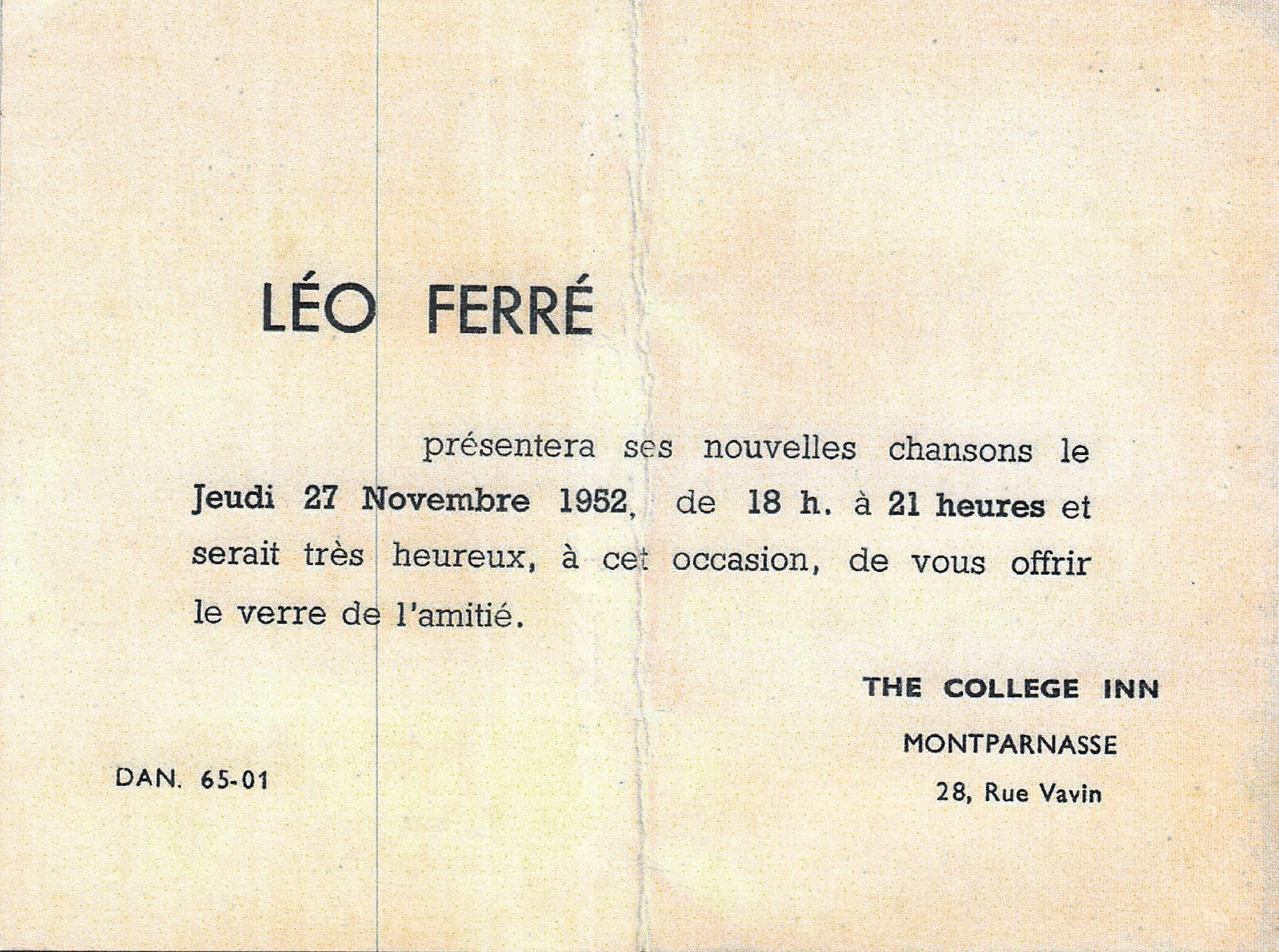 Invitation pour le jeudi 27 novembre 1952 au "College Inn" à Montparnasse où Léo Ferré présentera à cette occasion ses nouvelles chansons