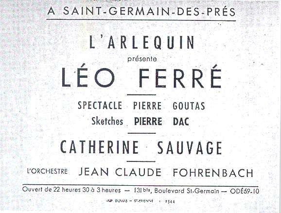 Il chante plusieurs mois à l’Arlequin avec Catherine Sauvage.