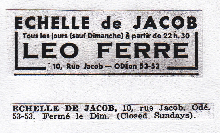 L’Escalier de Moïse, c’est le cabaret L’Échelle de Jacob, évidemment, sis 10, rue Jacob, dans le sixième arrondissement de Paris, ouvert à Noël 1948. Mme Lechose, c’est Mme Lebrun, Suzy Lebrun, venue de Caen, une figure de Saint-Germain-des-Prés sur qui l’on possède plusieurs témoignages. Elle reprendra l’endroit qui, rénové, ouvrira le 15 décembre 1950. On réserve à Odéon 53-53.