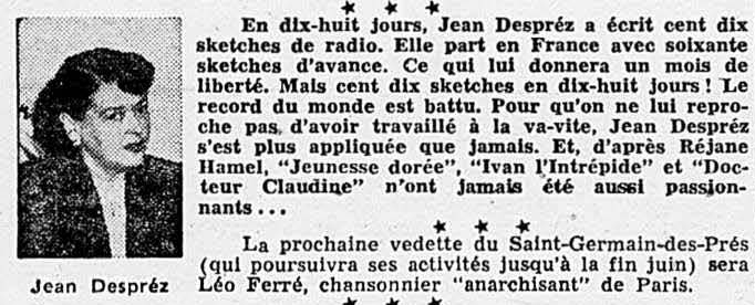 Sur le plan artistique, cependant, elle « sent » sa programmation, son choix est sûr et elle engage Jacques Douai, Jacqueline Villon, Raymond Devos, Cora Vaucaire. Elle dit pouvoir se passer des journalistes et les met à la porte. Léo Ferré chante chez elle en mars 1953, tous les jours sauf le dimanche, à partir de 22 h 30.