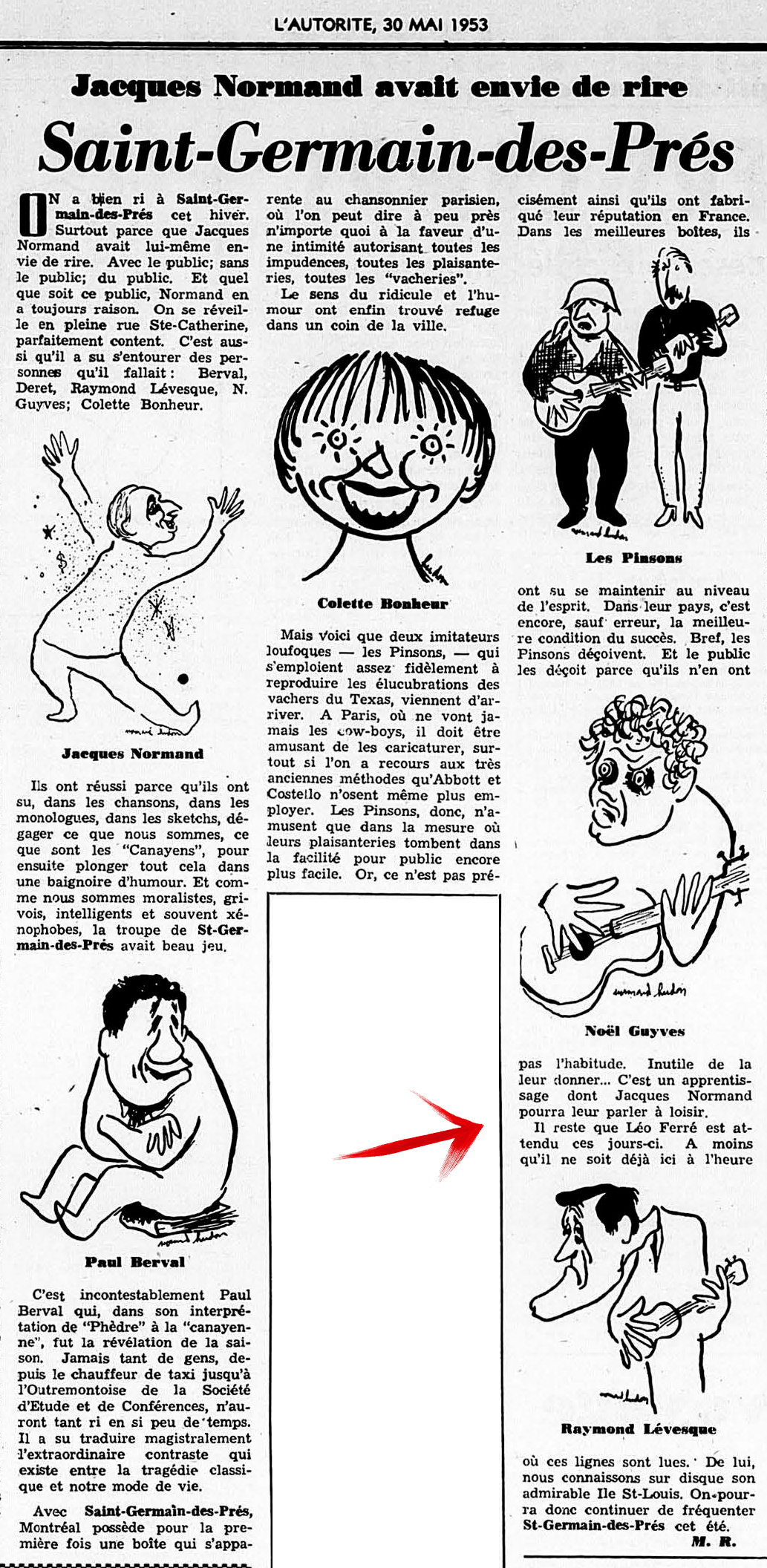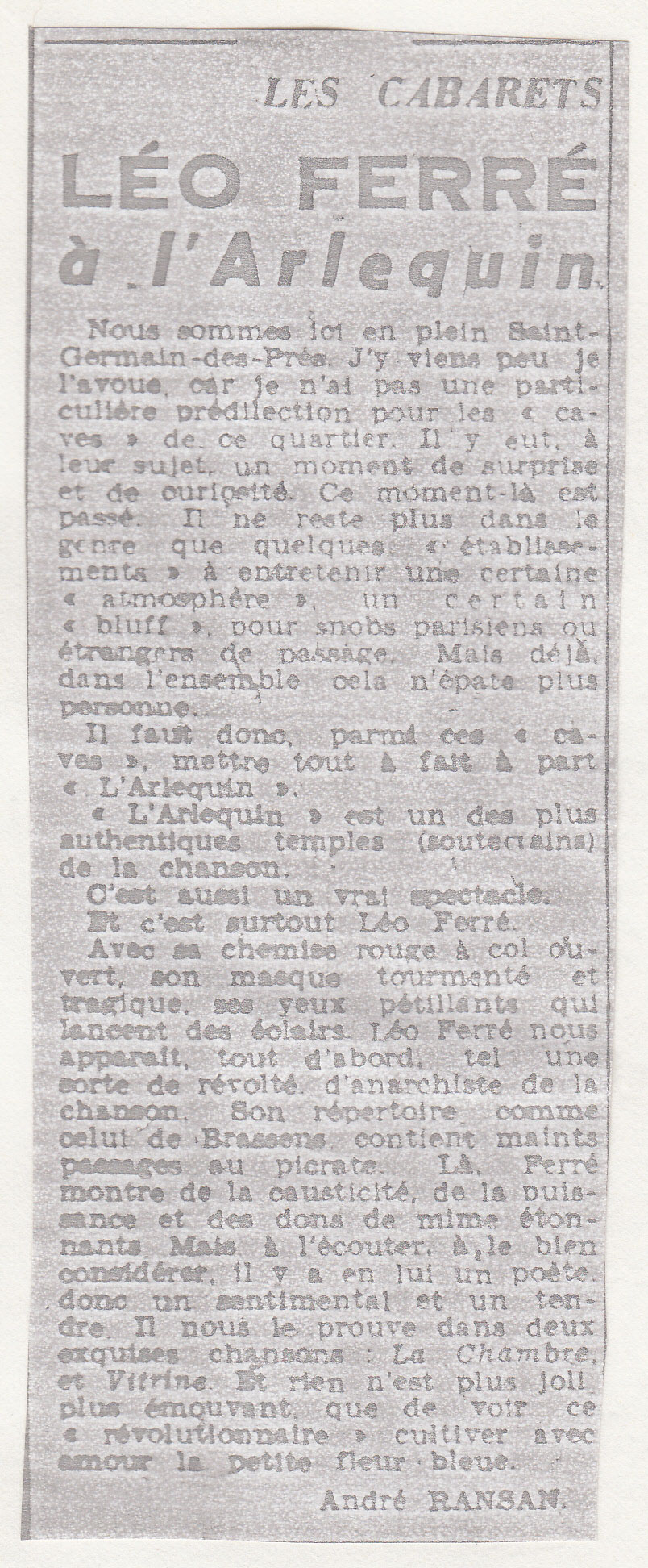 En 1953, Léo Ferré chante, depuis des années, dans des cabarets parisiens. Il est remarqué d’un petit nombre de connaisseurs, pas du grand public. Il n’a pas encore connu les grandes scènes de music-hall. À Saint-Germain-des-Prés qui, pour lui, évoque les difficultés plutôt qu’un magnifique temps jadis, il existe pourtant un cabaret, l’Arlequin.