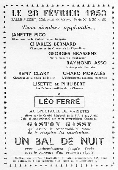 28.02 : Gala de soutien au Monde Libertaire avec Léo Ferré en vedette et Georges Brassens en 1ère partie.