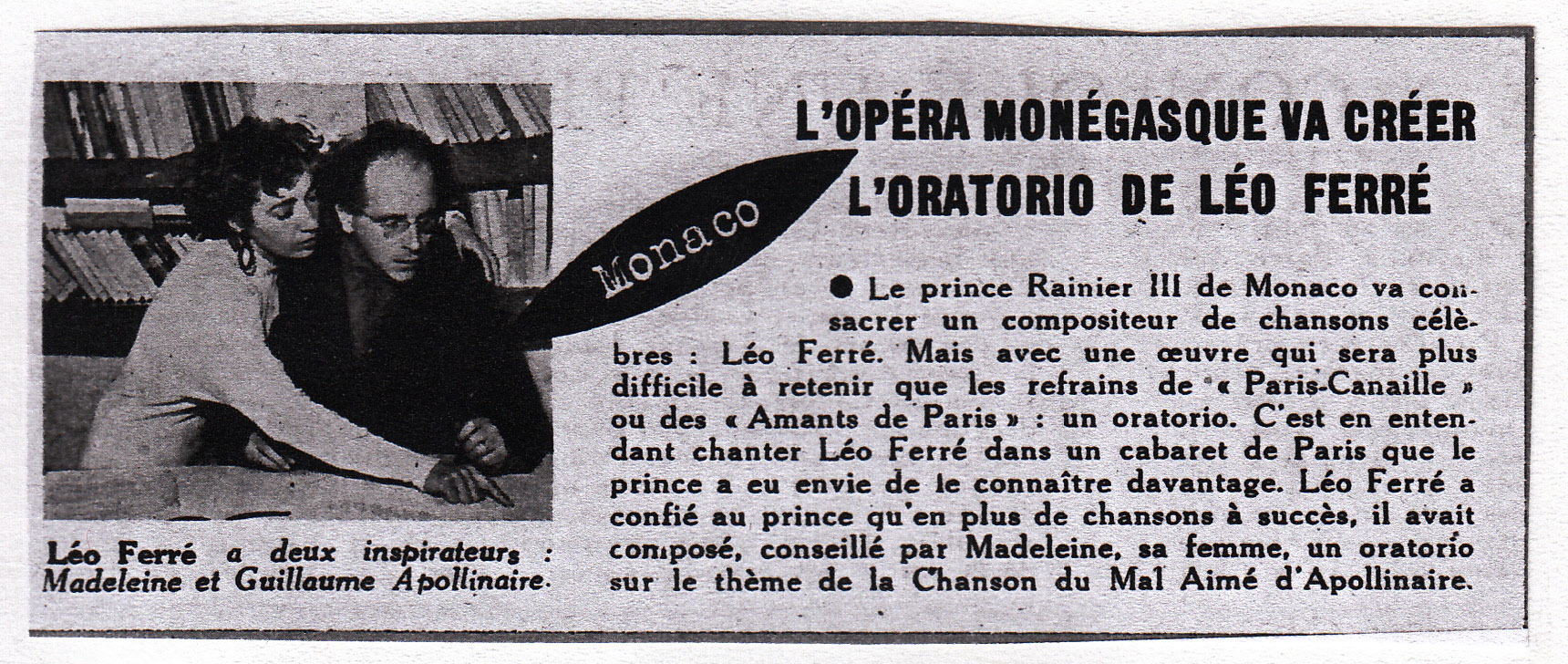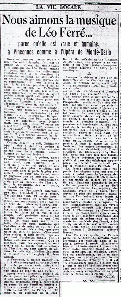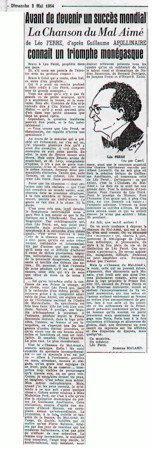 • "Avant de devenir un succès mondial, La chanson du Mal Aimé de Léo Ferré, d'après Guillaume Apollinaire, connait un triomphe monégasque"