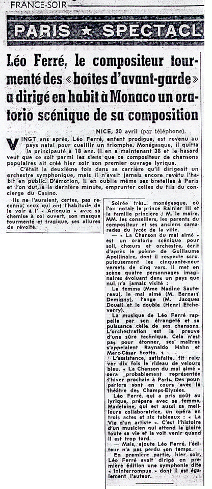• "Léo Ferré, le compositeur tourmenté des "boîtes d'avant-garde" a dirigé en habit à Monaco un oratorio scénique de sa composition