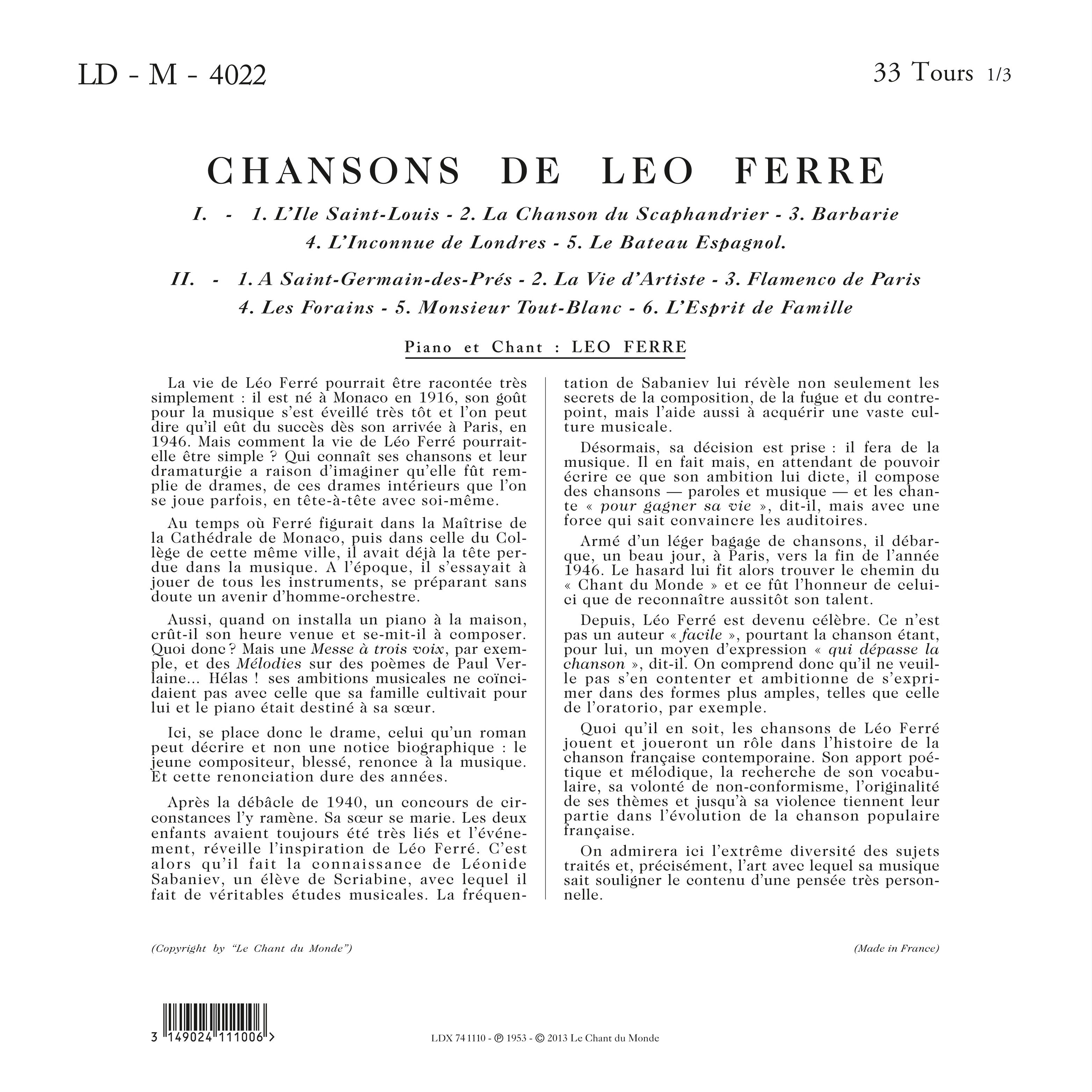 Le 22.02, sortie du disque : Chansons de Léo Ferré au Chant du Monde.