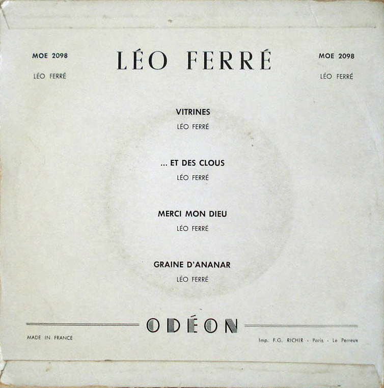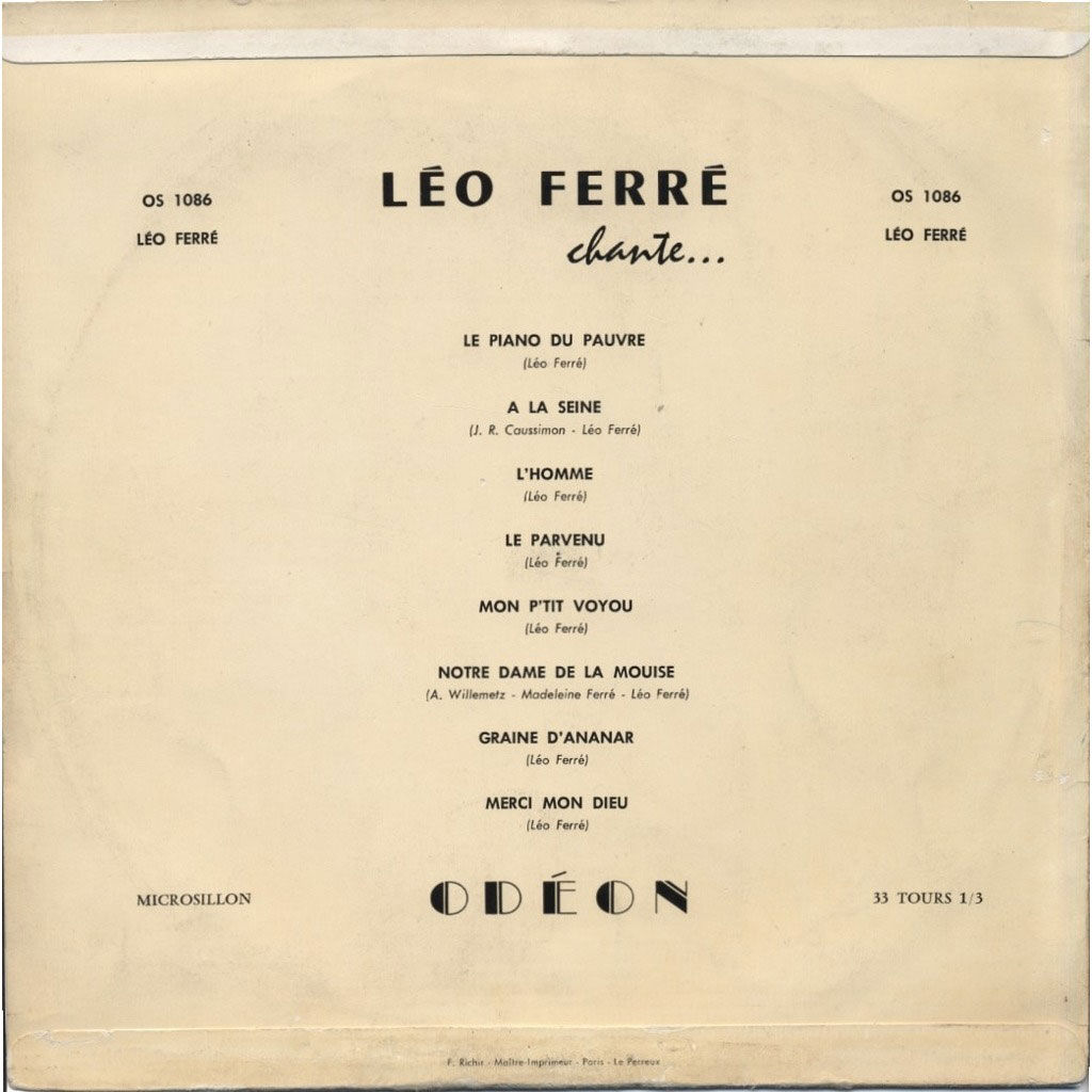 Les séances d’enregistrements de Ferré avec l’orchestre de Jean Faustin reprennent chez Odéon en mars et avril : À la seine, Le parvenu, L’homme et surtout Le piano du pauvre (que de multiples interprètes adopteront au même moment : Patachou, Catherine Sauvage, Rose Mania, Lucien Jeunesse, Germaine Montero…)