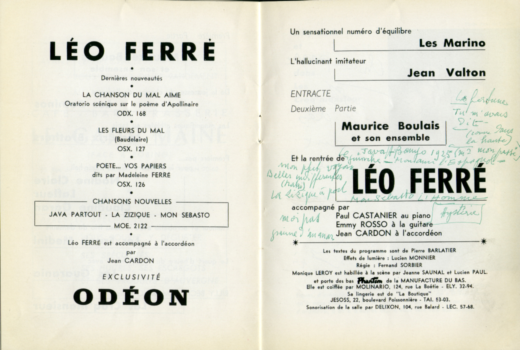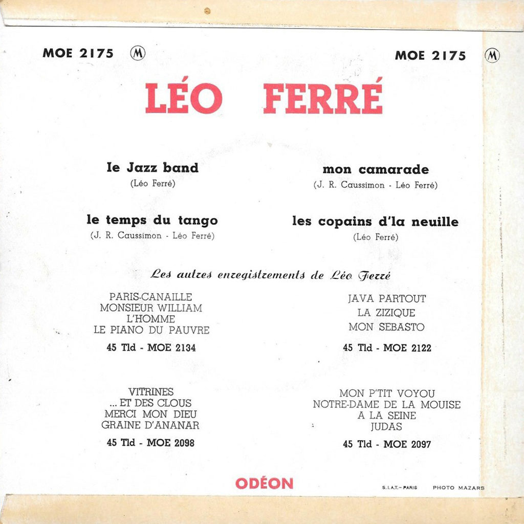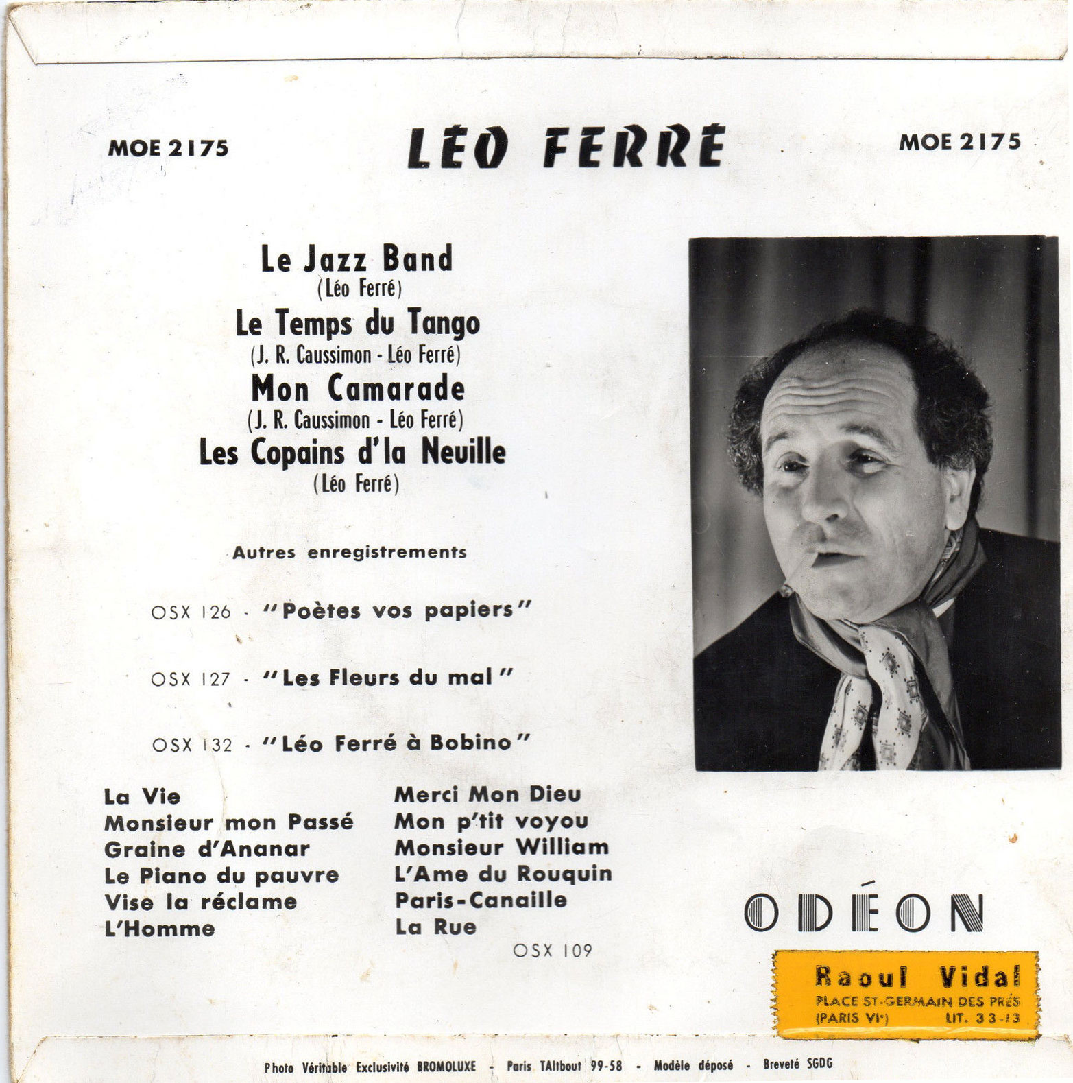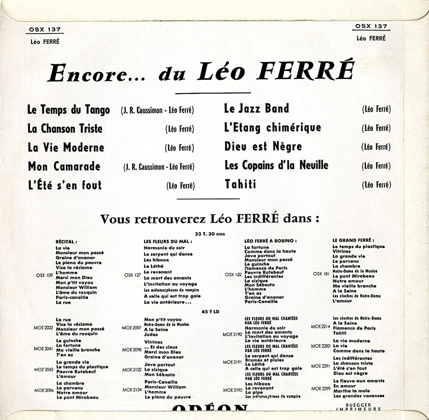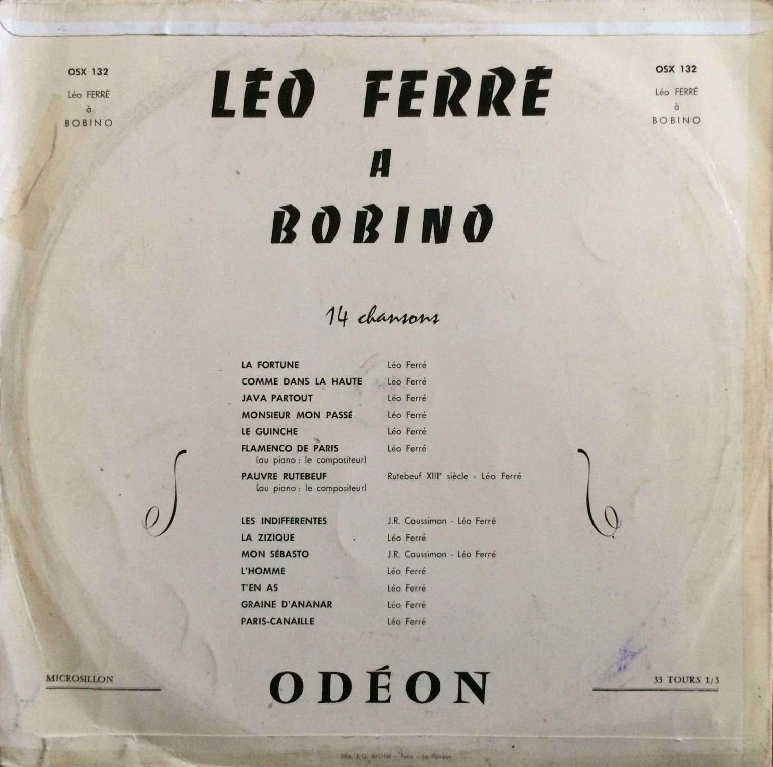 Sortie chez Odéon, de Léo Ferré à Bobino enregistré en public au Théâtre de Bobino (Paris), entre le 3 et le 15 janvier 1958.