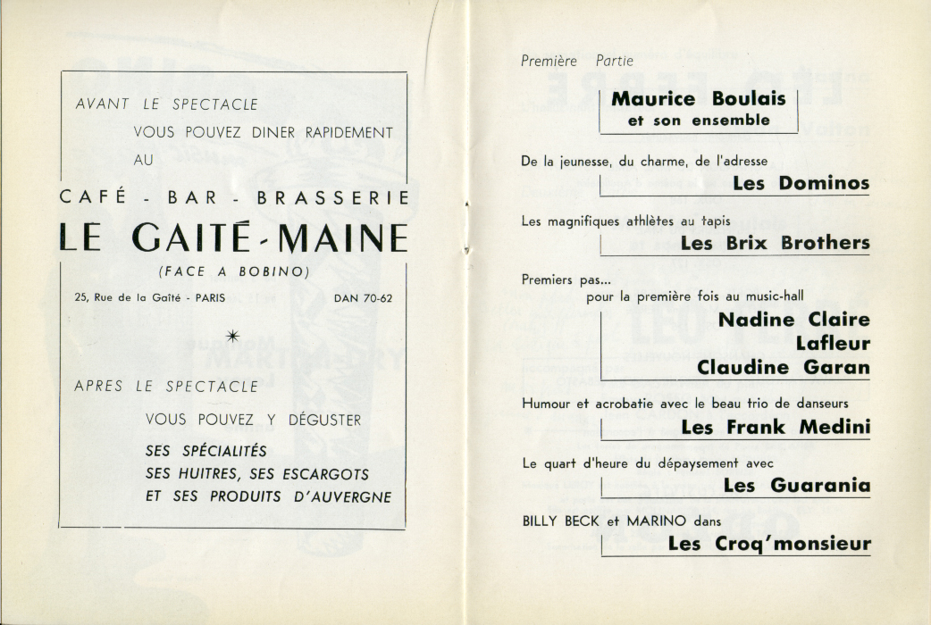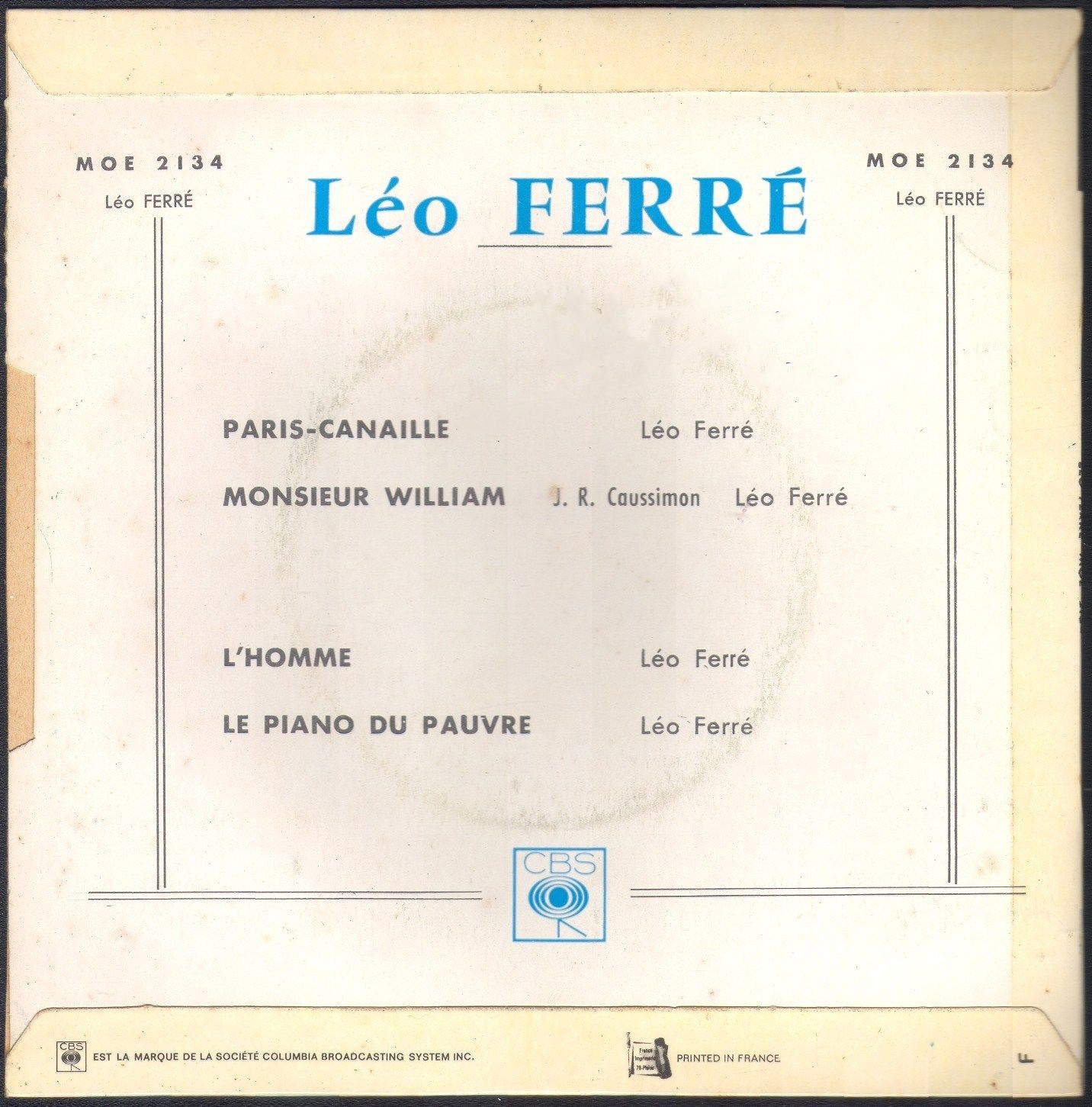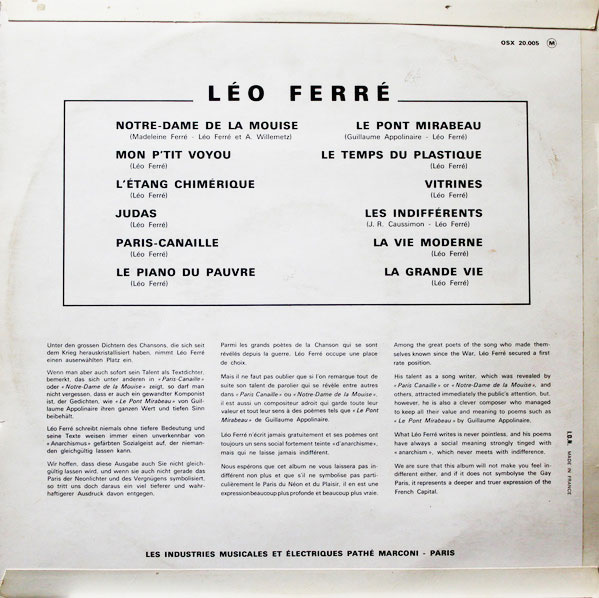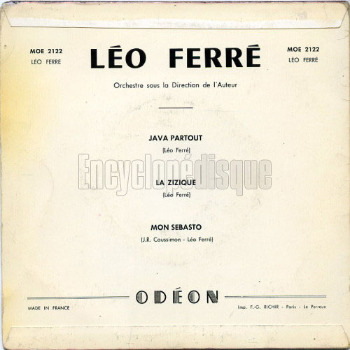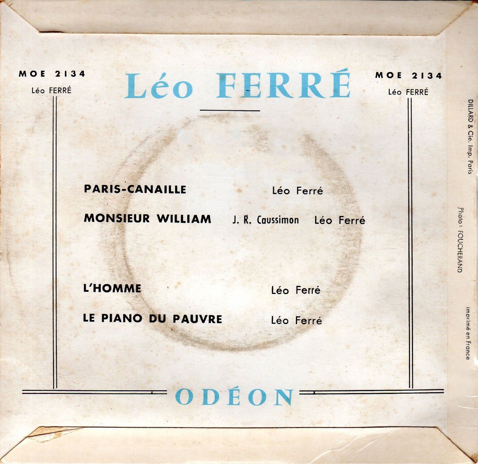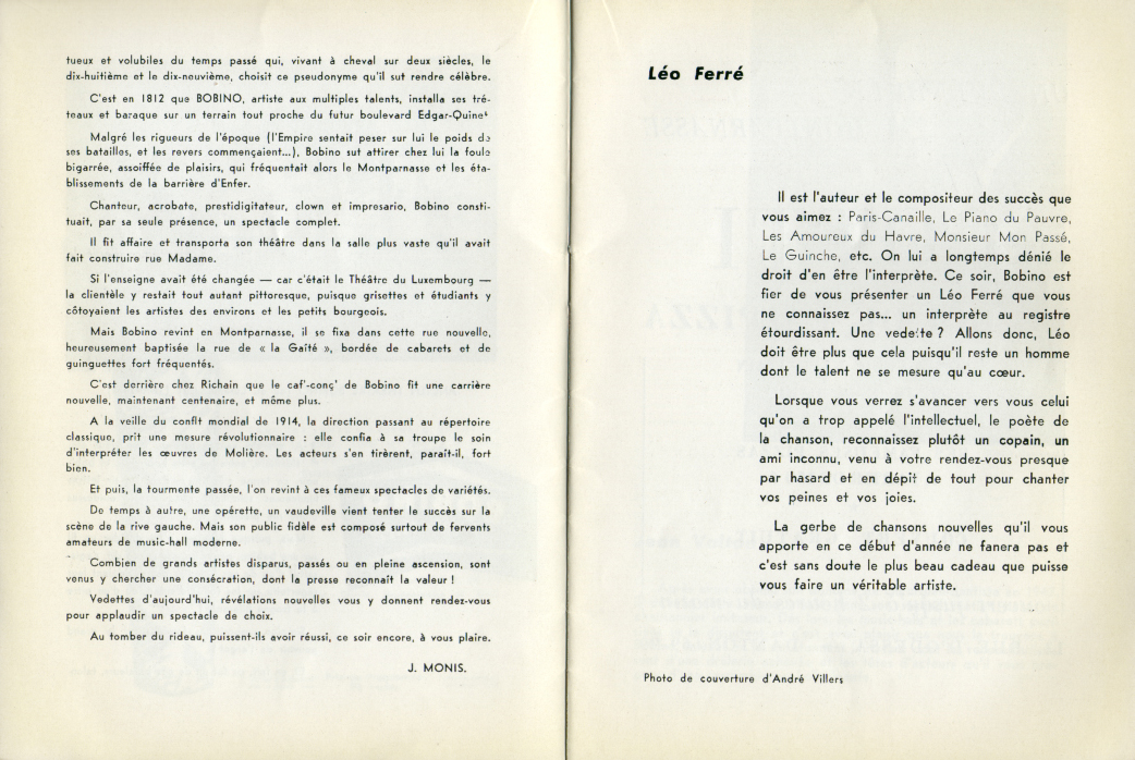 Sortie chez Odéon, de Léo Ferré à Bobino enregistré en public au Théâtre de Bobino (Paris), entre le 3 et le 15 janvier 1958.
