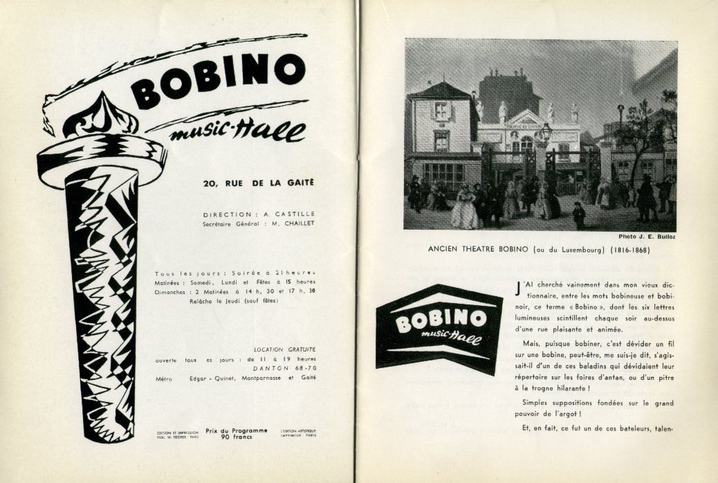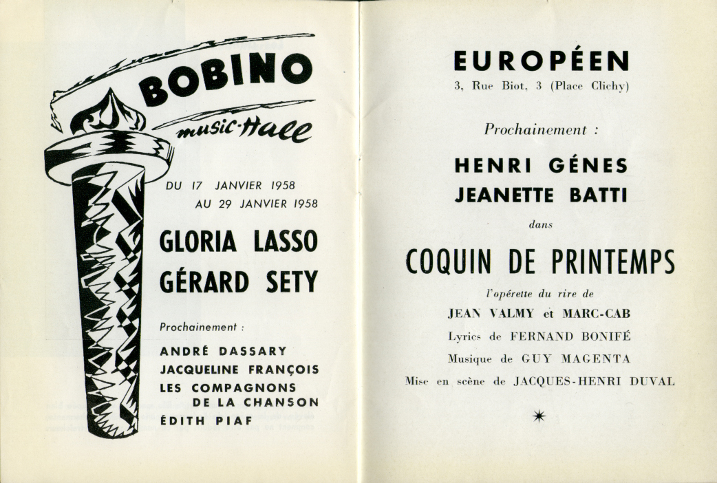 Premier tour de chant à Bobino en vedette accompagné d’un trio de musiciens : l’accordéoniste Jean Cardon, le pianiste aveugle Paul Castanier (dit Popaul rencontré chez Plumeau) et le guitariste Barthélémy « Mimi » Rosso.