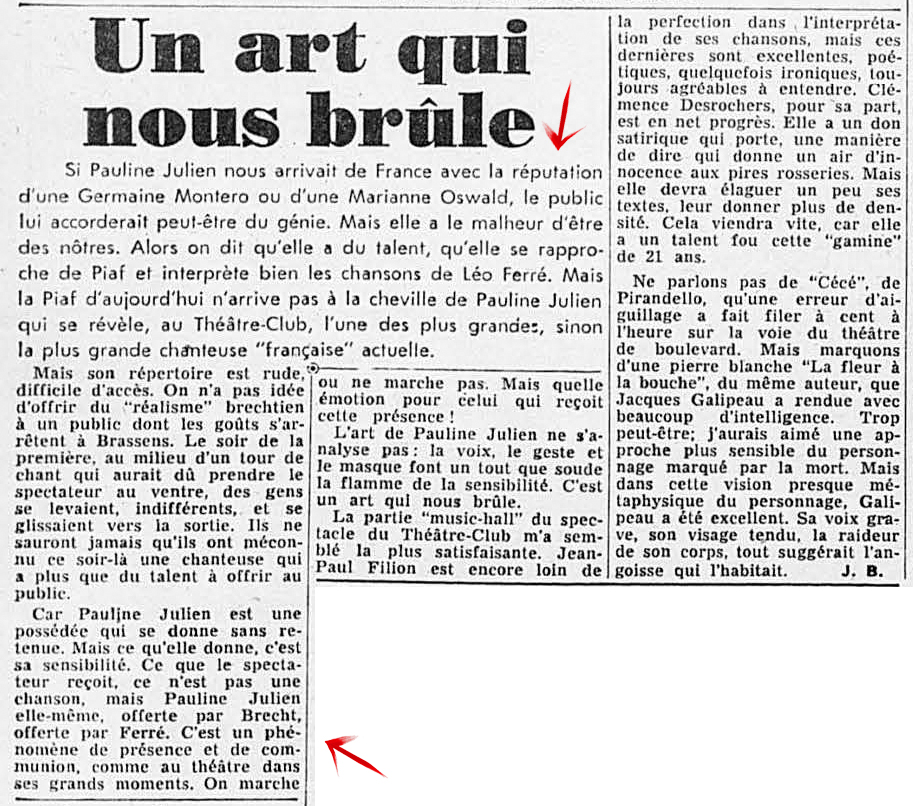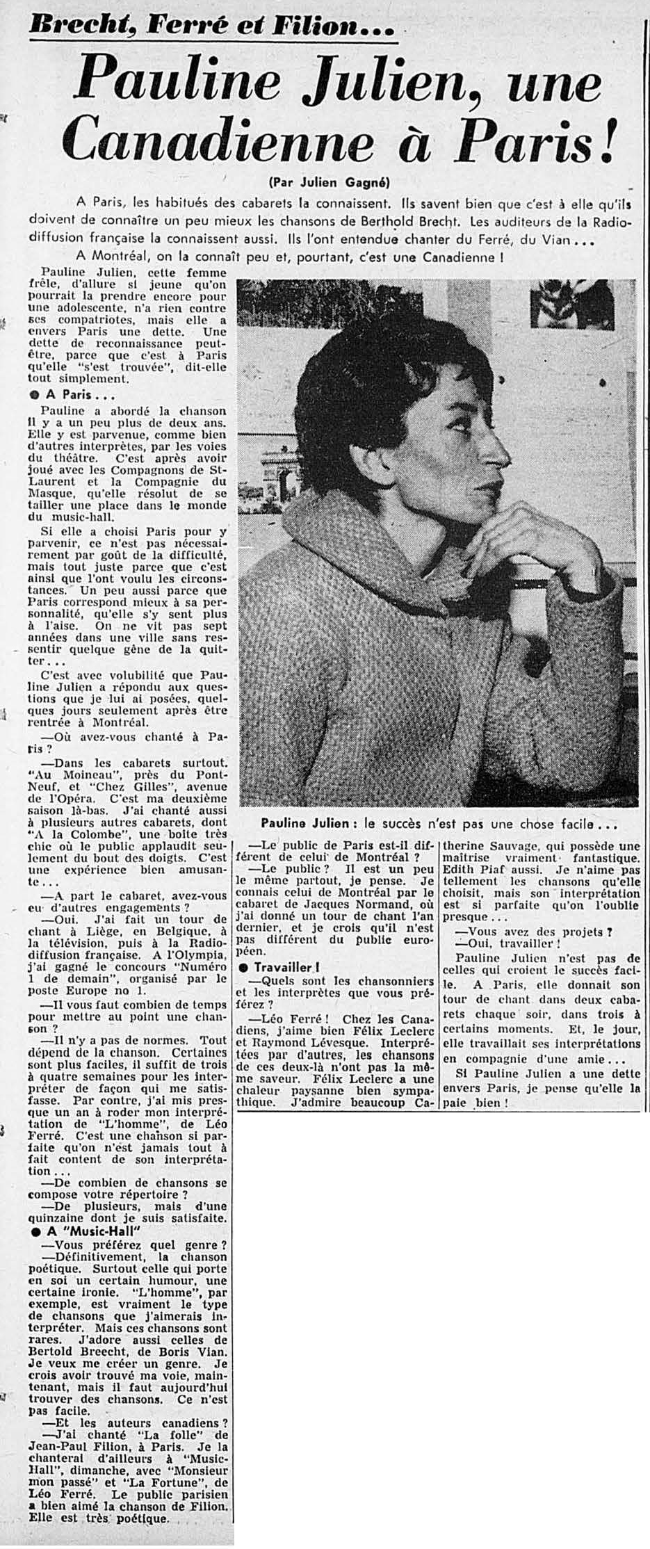 • Brecht, Ferré et Filion... Pauline Julien, une Canadienne à Paris !