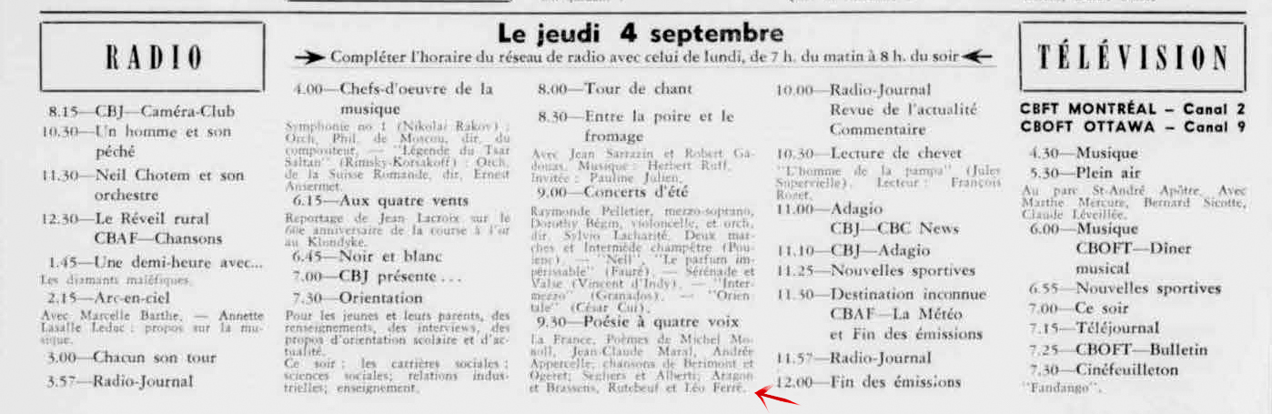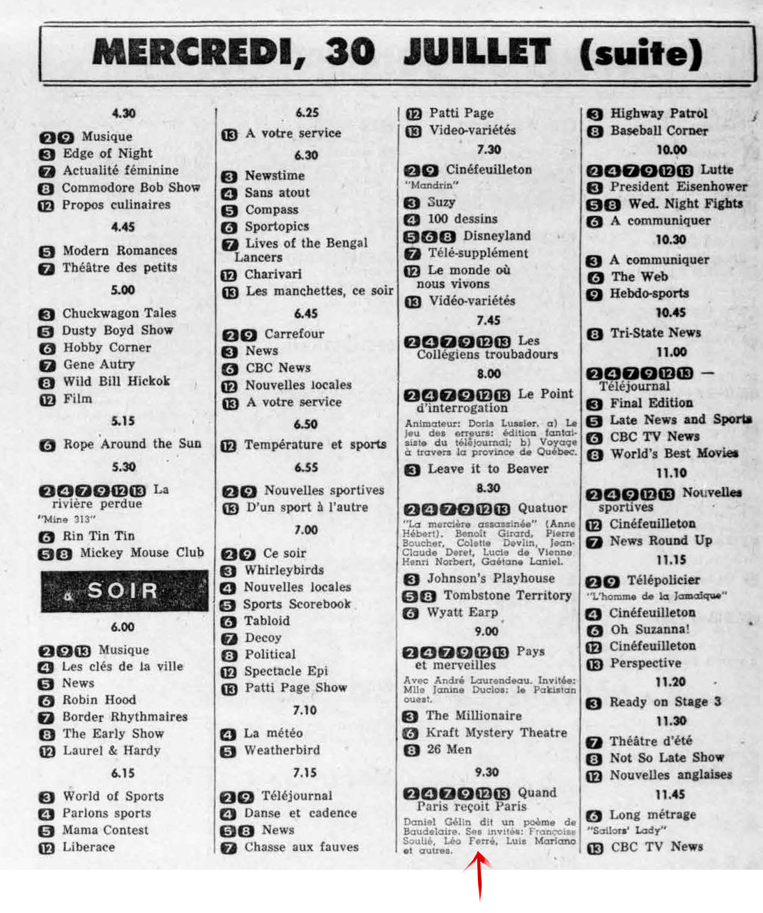 La semaine à Radio-Canada, 1950-1966, samedi 30 août 1958