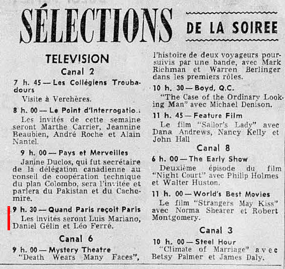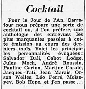 20.02 : dirige vingt musiciens au studio d’enregistrement de Boulogne-Billancourt pour la musique du film Douze heures d’horloge (chanson phare du générique La poisse chantée par Catherine Sauvage) du cinéaste hongrois Geza von Radvanyi qui ne l’utilisera finalement pas.