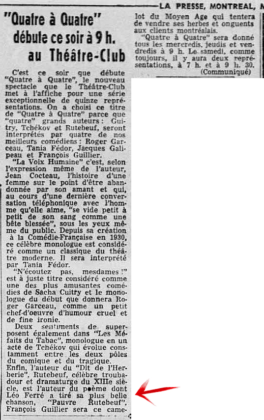 • "Quatre à quatre" débute ce soir à 9 h. au Théâtre Club