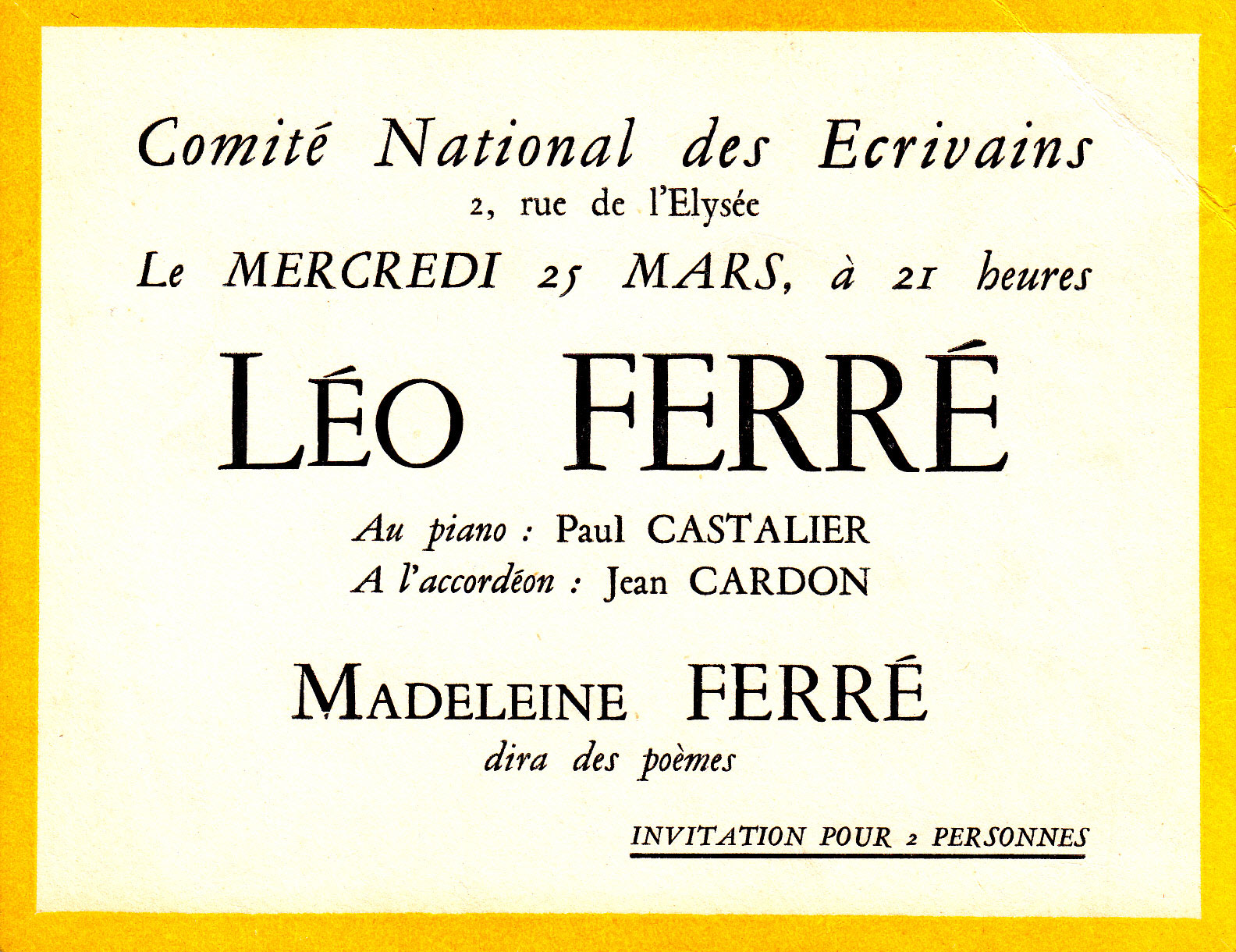 Invitation pour le mercredi 25 mars 1959 au "Comité National des Ecrivains" avec Paul Castanier et Madeleine Ferré