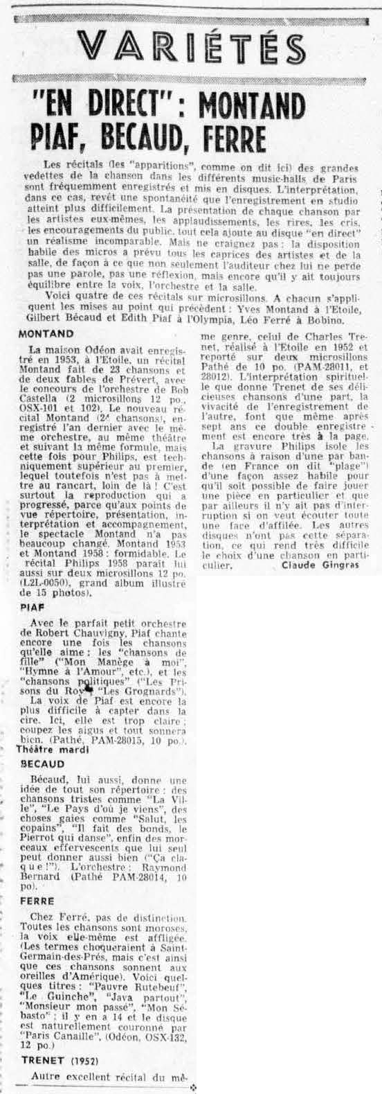 • "En direct" : Montand, Piaf, Bécaud, Ferré