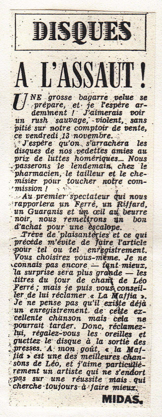 Ferré est flatté par le compliment. Il évoque les mafias du show business : les limonadiers de Saint-Germain des Prés et la mafia des music halls.