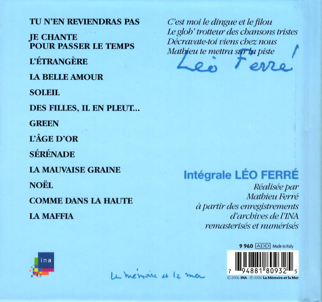 Source : CD Léo Ferré - 1959 - La mauvaise graine - La mémoire et la mer (07 04 2006) - Ref.9960