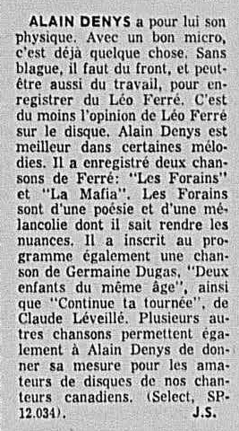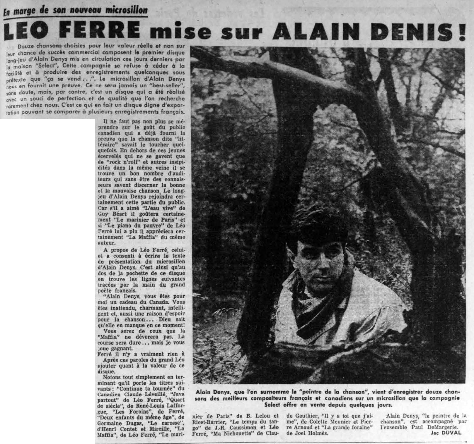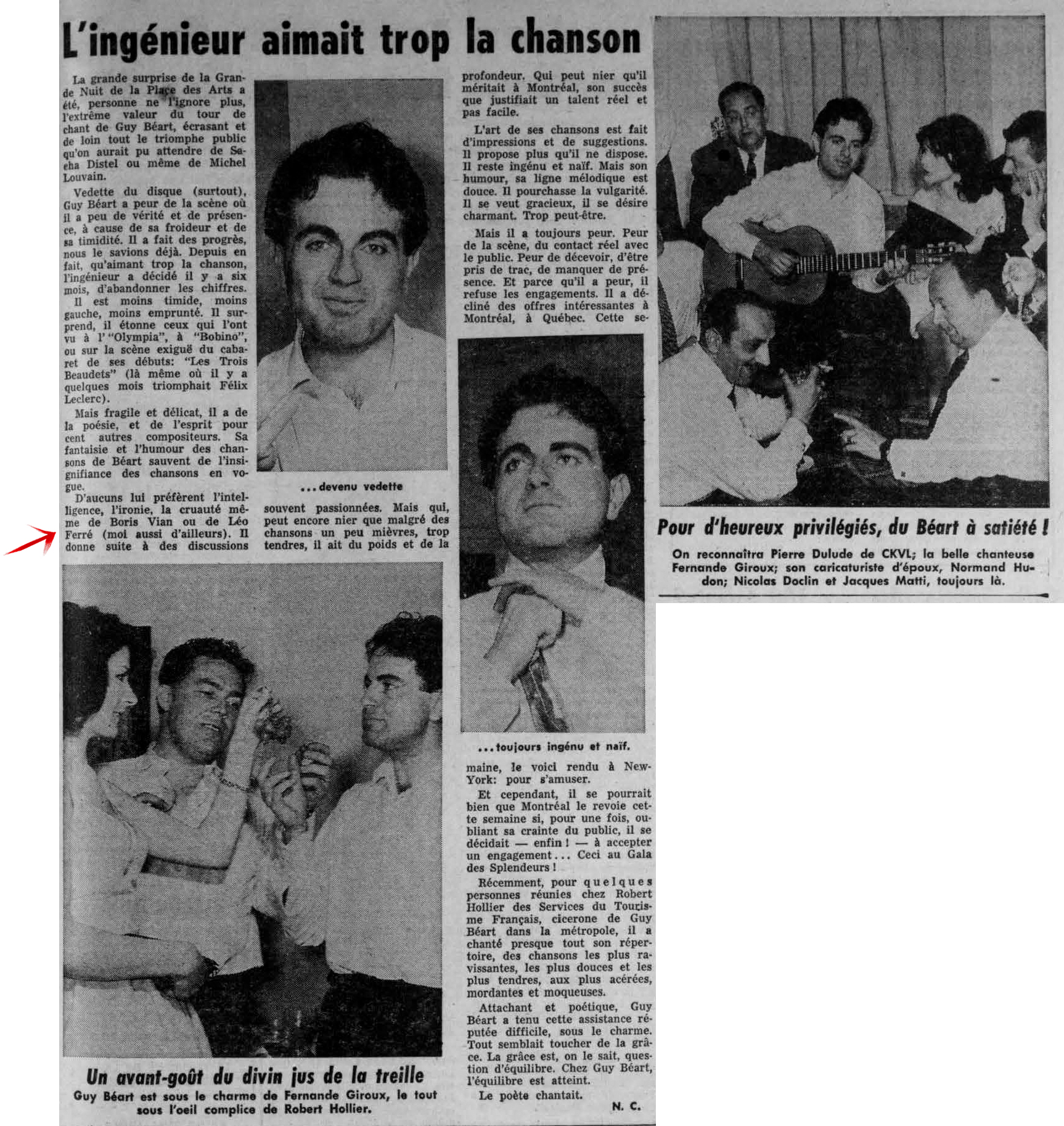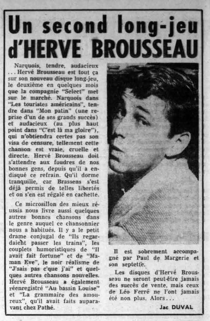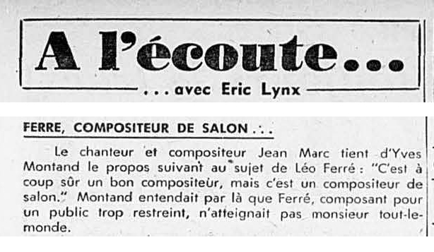 Je dois à la vérité de dire en tout état de cause que le milieu dit « de la chanson » me gêne par sa médiocrité et ses mauvaises odeurs. Ils ont bien de la chance, les Carco, Queneau, Mac Orlan, Mauriac, Sartre et autres artistes majeurs, de n’y tremper que par hasard et de retourner aussitôt à leurs cimes littéraires où les critiques professionnels sont cultivés, adroits, les amitiés souvent particulières et le caviar apocryphe mais copieux. Ils vivent en bonne compagnie et à l’ombre de l’Institut. Moi, je vis dans une fabrique de conserves, où l’on met en boîte du caca qui a perdu jusqu’à sa personnalité la plus élémentaire.