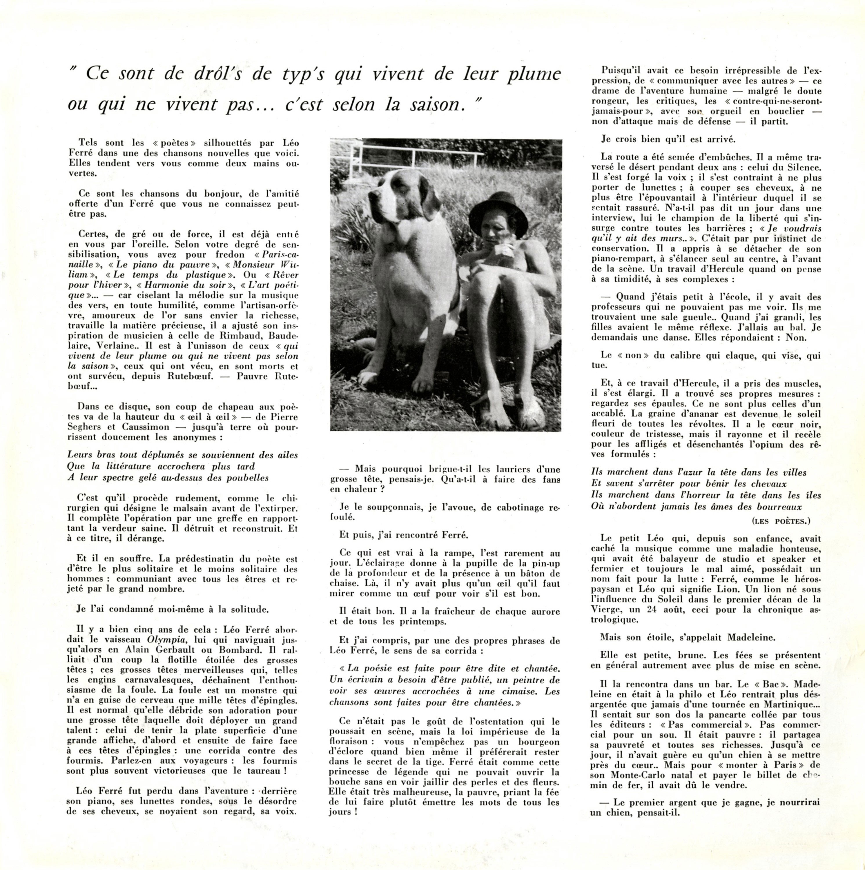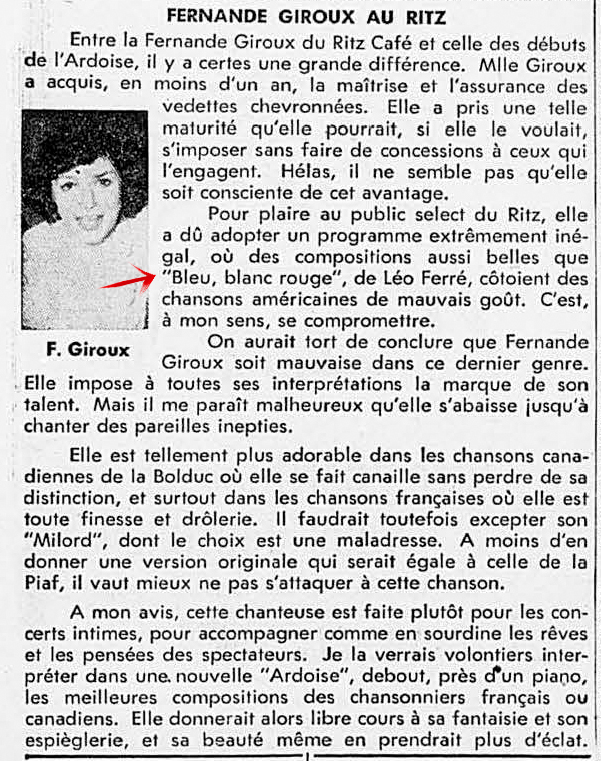 Le drame, voyez-vous, c’est d’être à côté de la merde et de s’entendre dire qu’on ressemblerait plutôt à une rose. Lorsque j’écris des paroles dites « violentes » on me dit que je suis un anarchiste de salon. Lorsque j’écris Le Guinche, une chanson sur le bal, un critique ami qui vient manger à la maison écrit qu’il est dommage que j’ai commis une chanson alimentaire. Il faut préciser que les critiques, dans mon métier, ne sont ni professionnels, ni adroits, ni rien. Comment concevoir une critique sérieuse à propos d’un art mineur, voyons ? Quant aux parasites de ce caca dont je parlais, ces critiques payés, il doit leur falloir une somme de complaisance et une habitude de la poubelle qui doit leur rendre le travail bien pénible. Ceux-là ne volent pas leur argent (personnellement, je préfère les égoutiers, ils ont au moins le prestige du service public et de grandes bottes en caoutchouc).