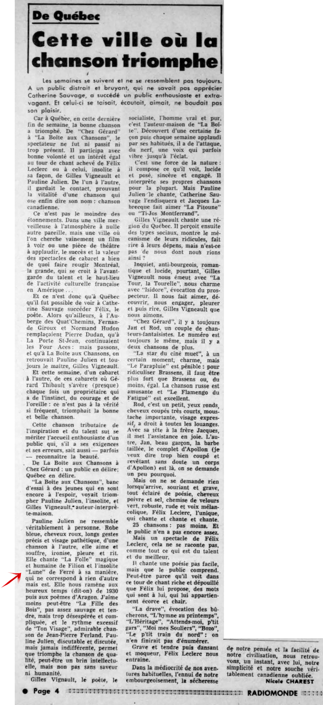 Aujourd’hui, n’importe qui fait une ou des chansons. Et quand je dis n’importe qui, ce n’est pas n’importe qui : écrivains de toutes tendances de l’Académie ou non, poètes « énèrèfisants », auteurs dramatiques, cinéastes, danseurs, producteurs de disques ou de films. La liste est longue et insipide. Je ne cite personne, ce n’est pas la peine. Je ne connais pas une parole qu’on en puisse retenir. Il est vrai qu’une prédestination à la médiocrité semble les poursuivre car dans leurs métiers respectifs ils ne sont pas les premiers, loin de là.