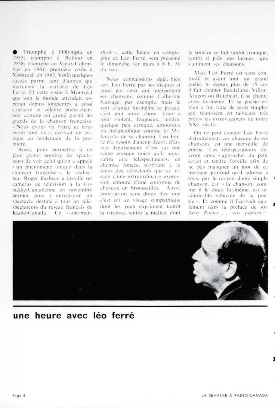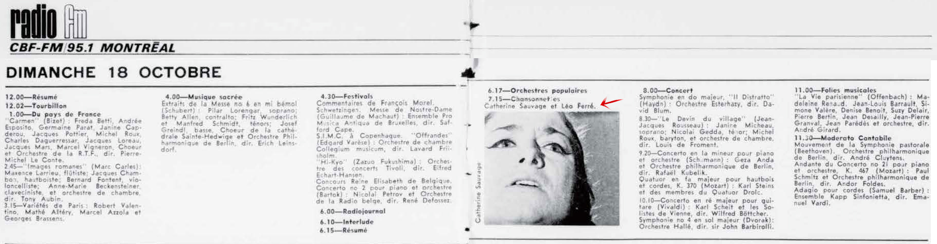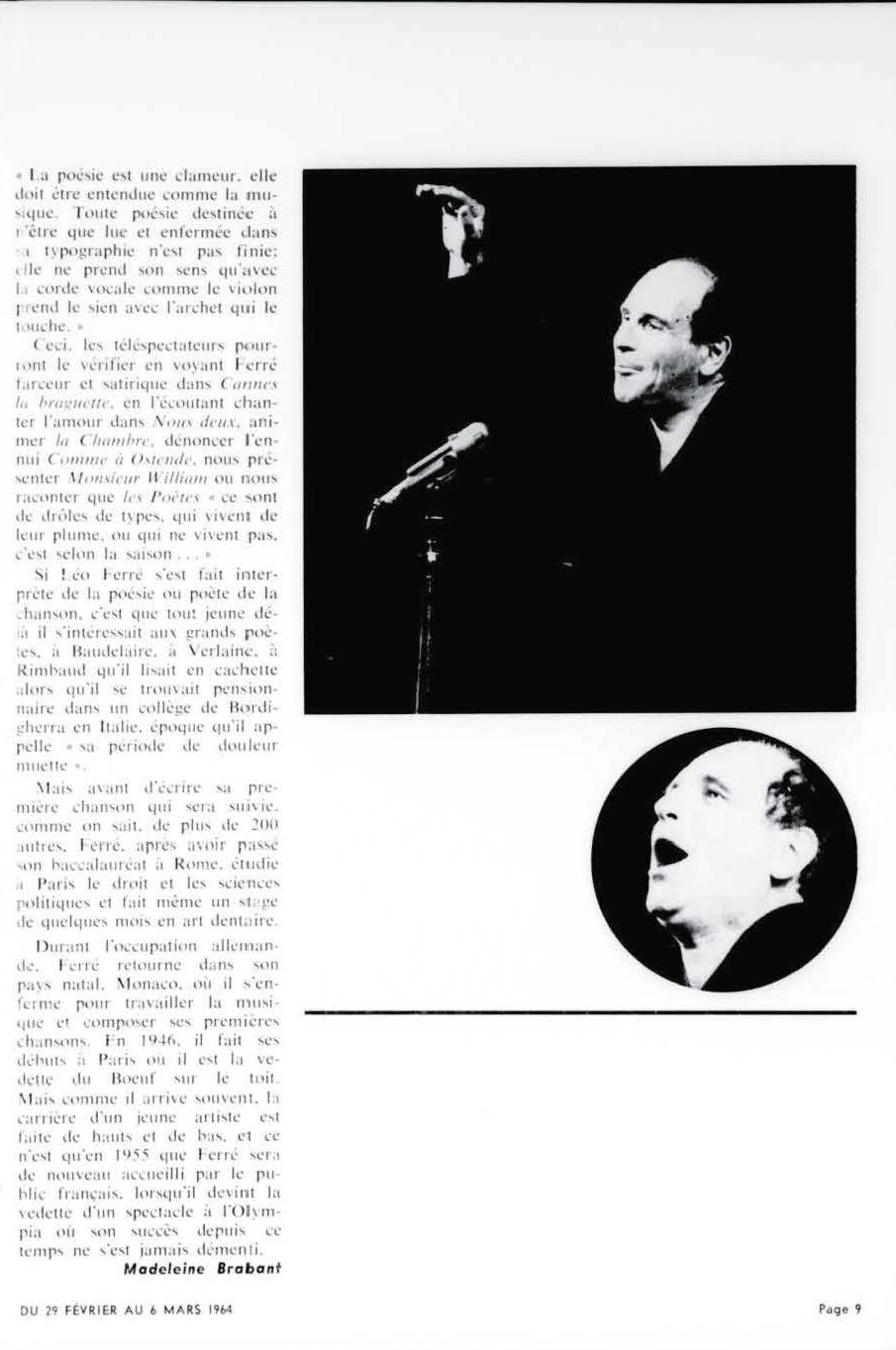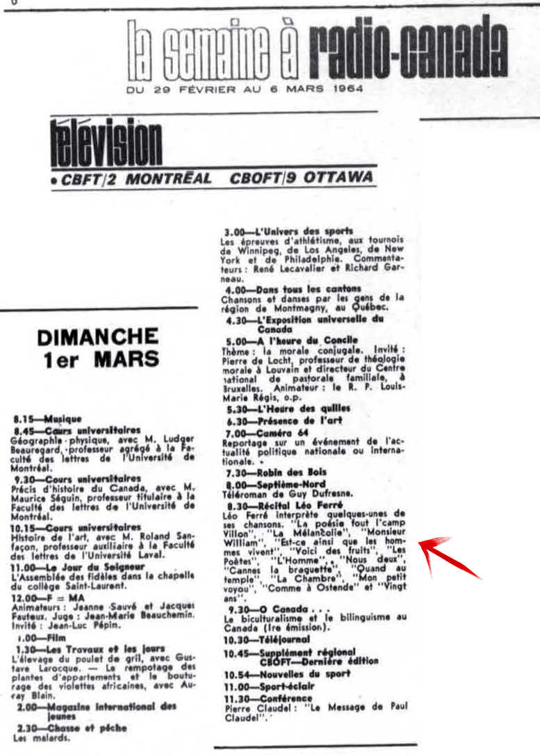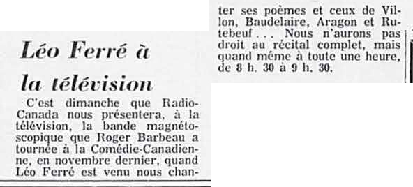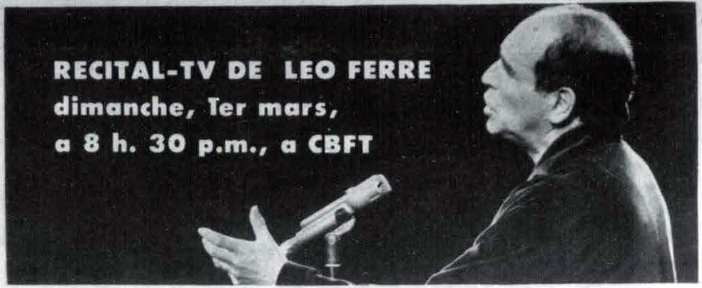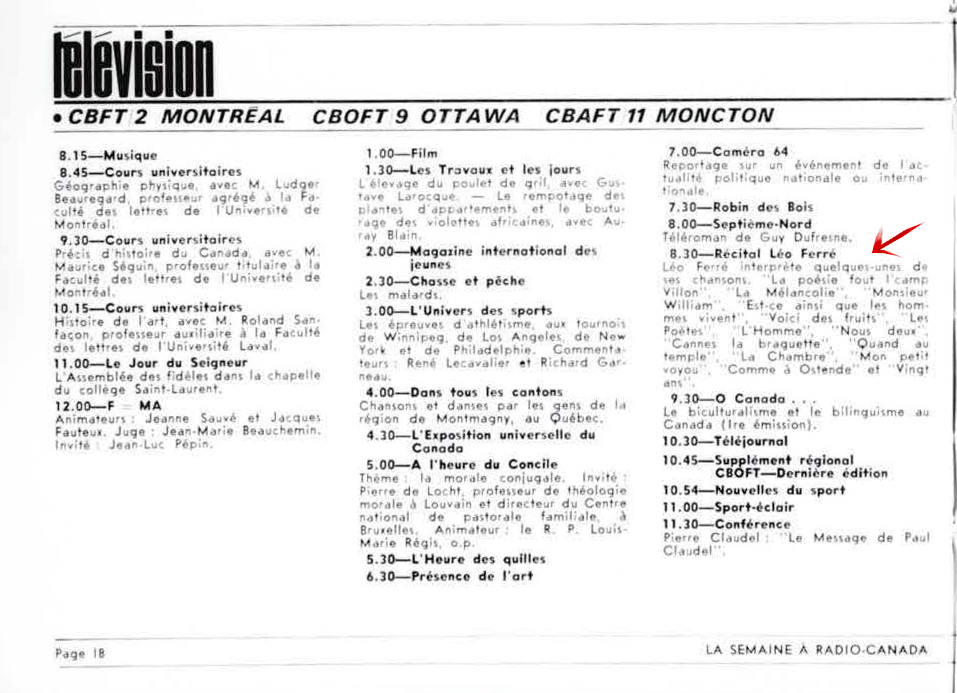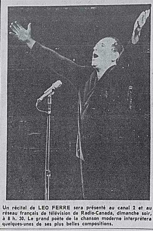 18.07 : Catherine Sauvage chante C'est l'homme et divers courts extraits de chansons de Léo Ferré dans l'émission Du yoyo au yéyé.