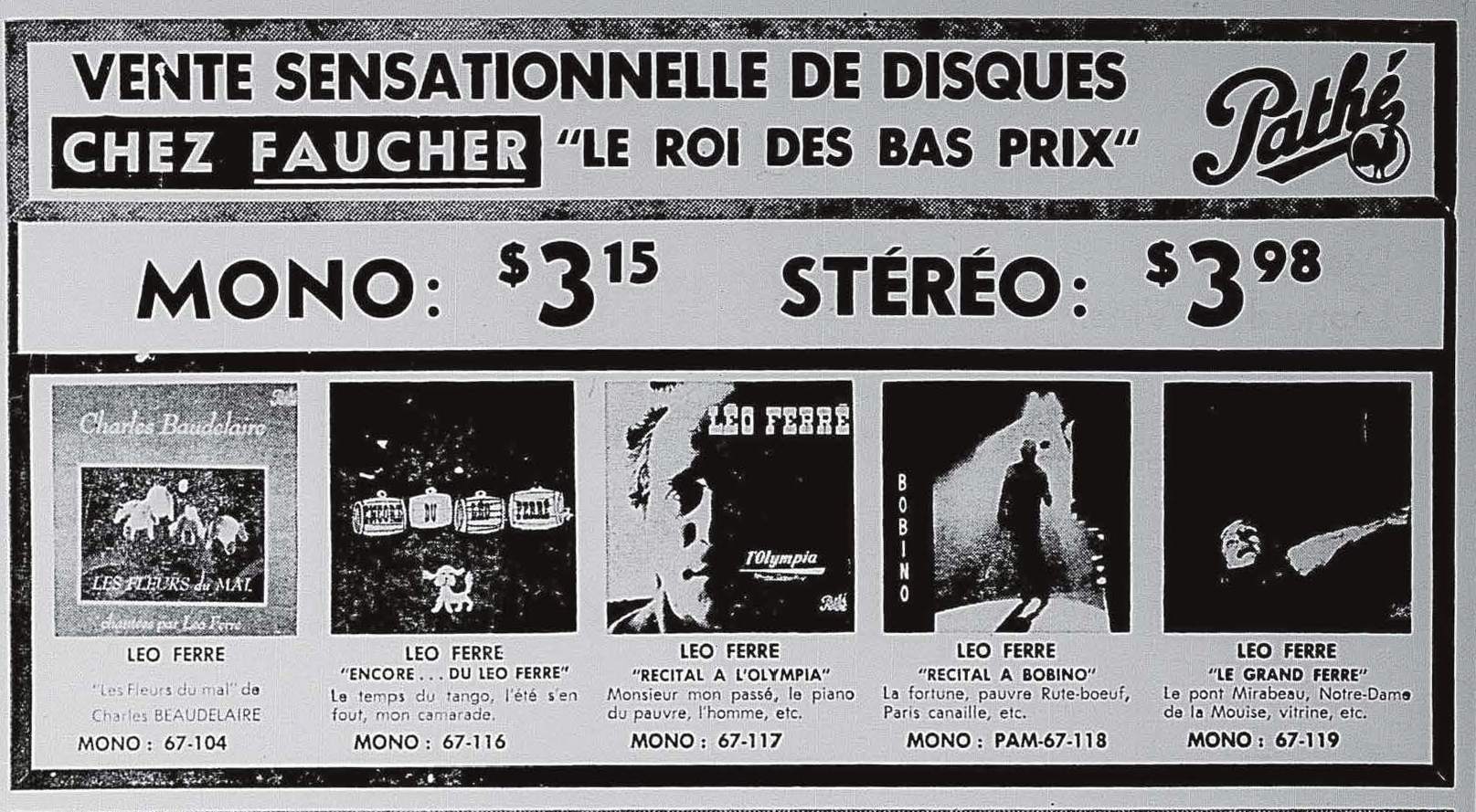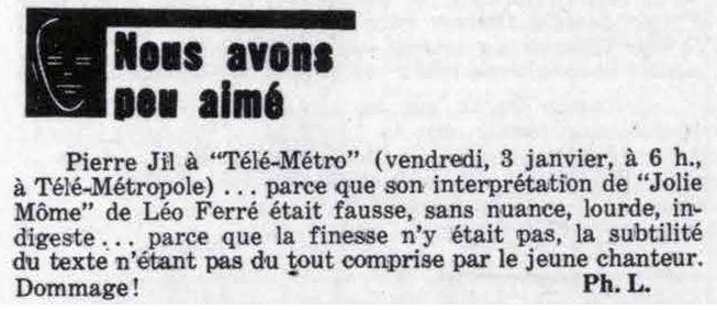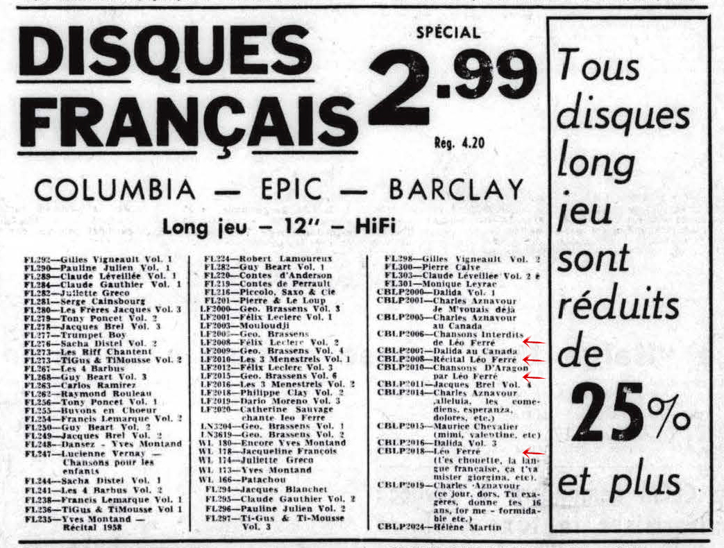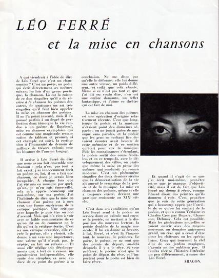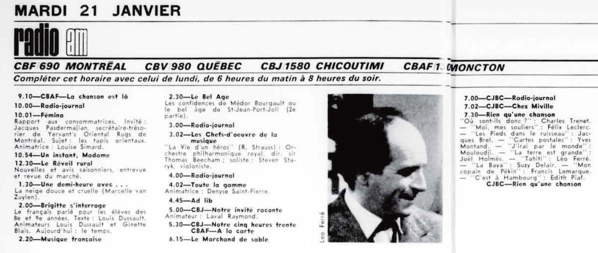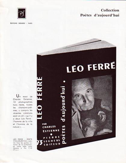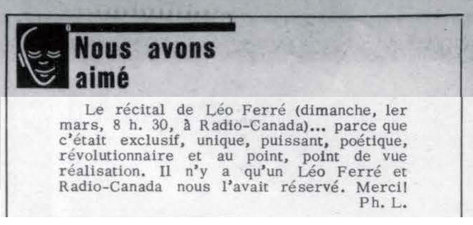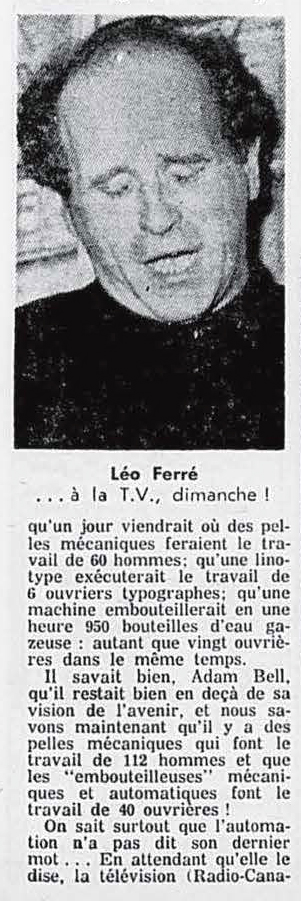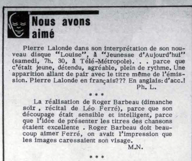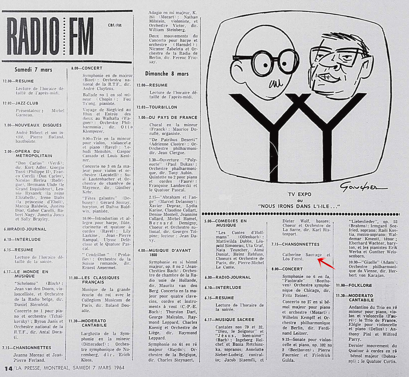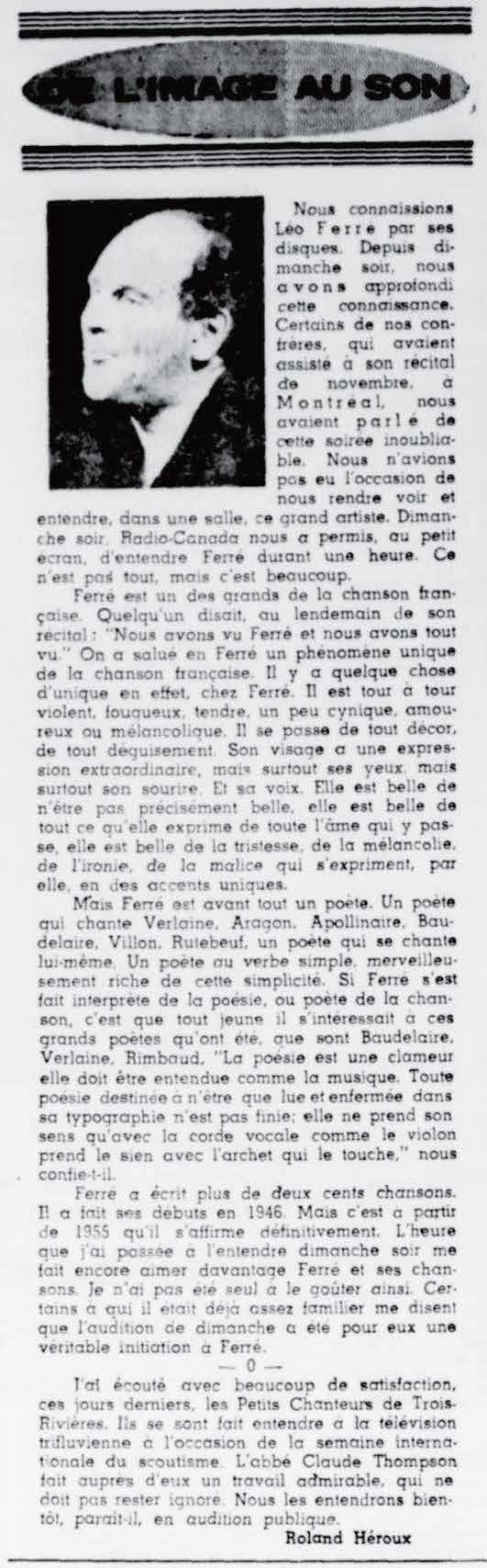 18.07 : Catherine Sauvage chante C'est l'homme et divers courts extraits de chansons de Léo Ferré dans l'émission Du yoyo au yéyé.