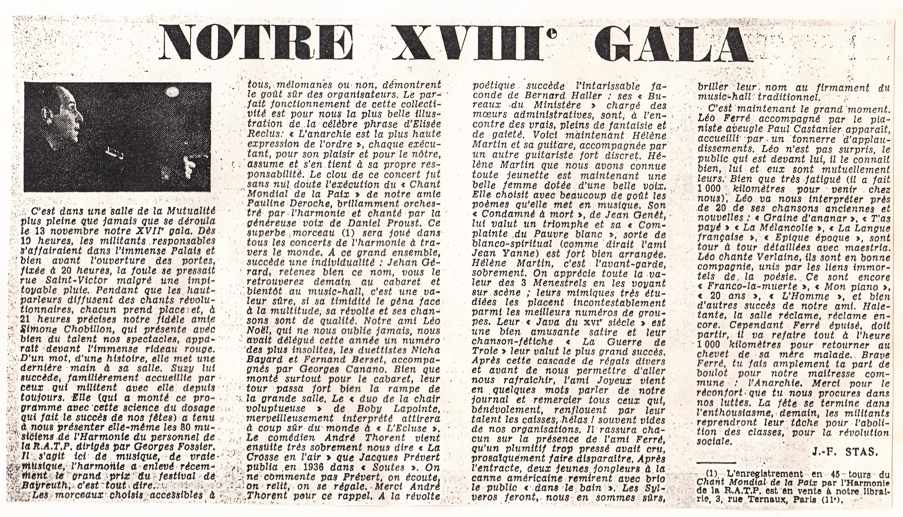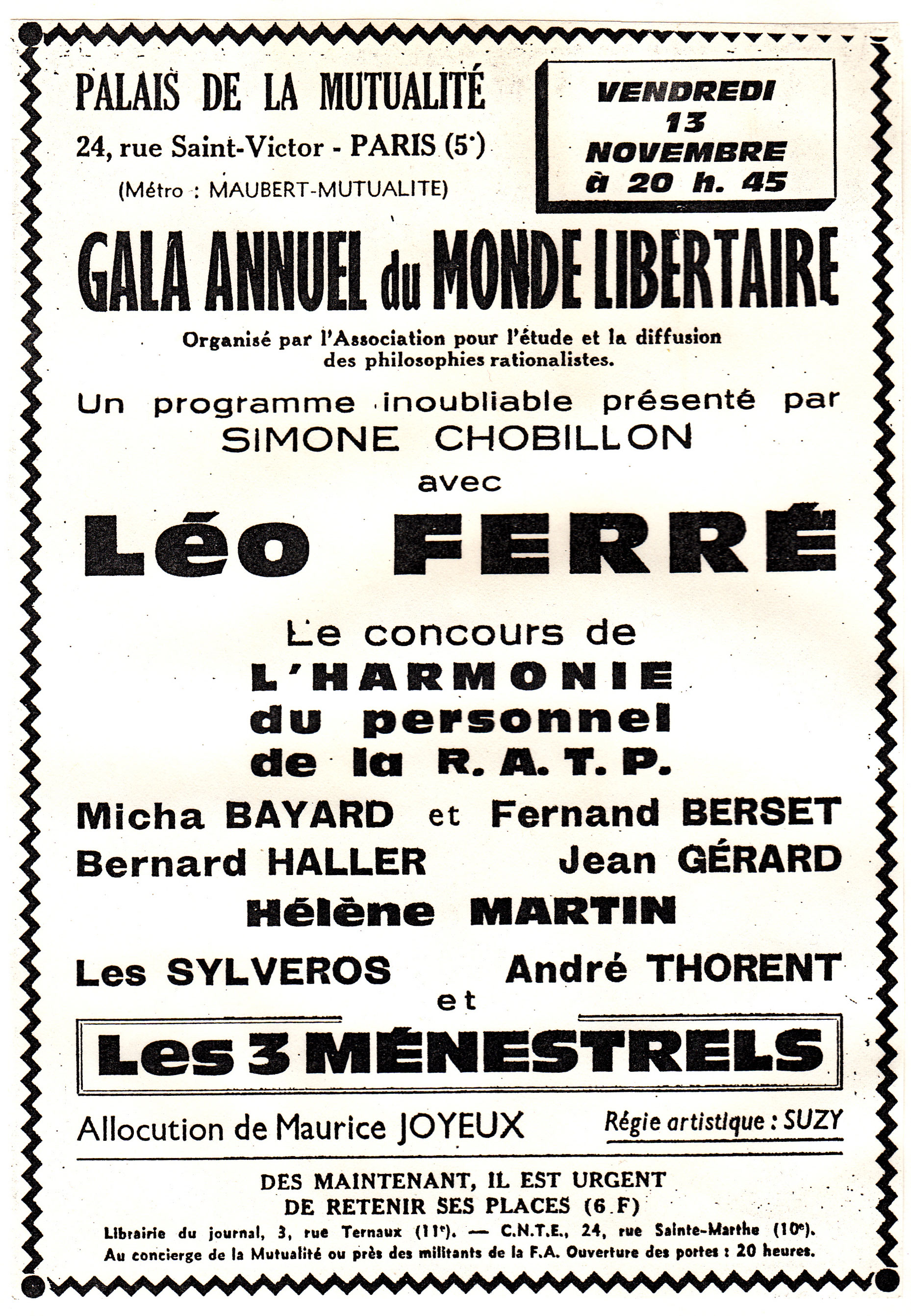 • Palais de la Mutualité - Gala annuel du Monde Libertaire - Vendredi 13 novembre