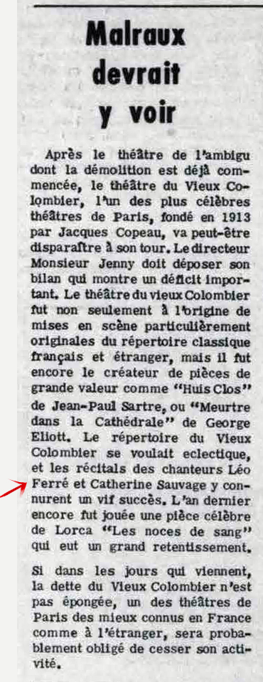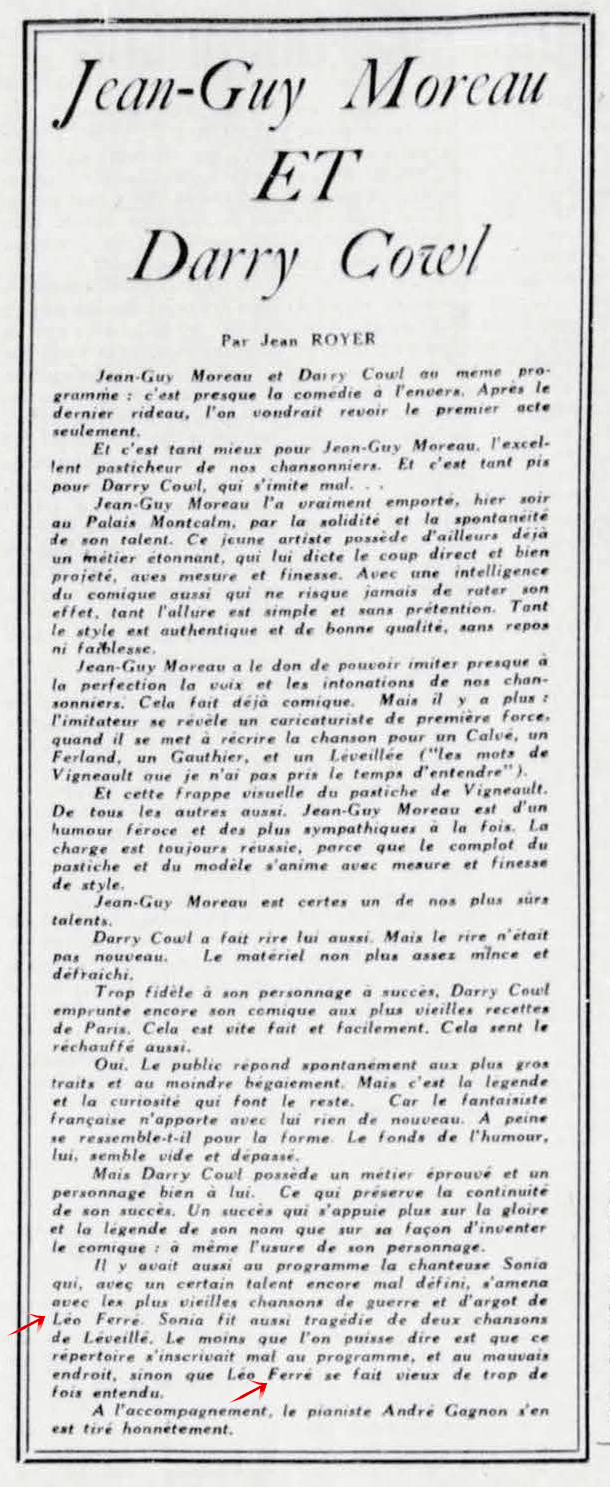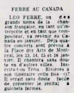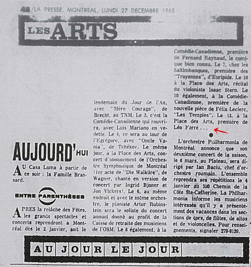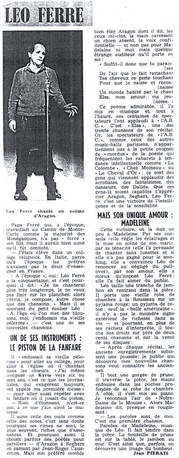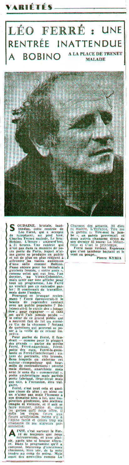 À partir du 17.03, Léo Ferré va remplacer au pied-levé Charles Trénet malade.
