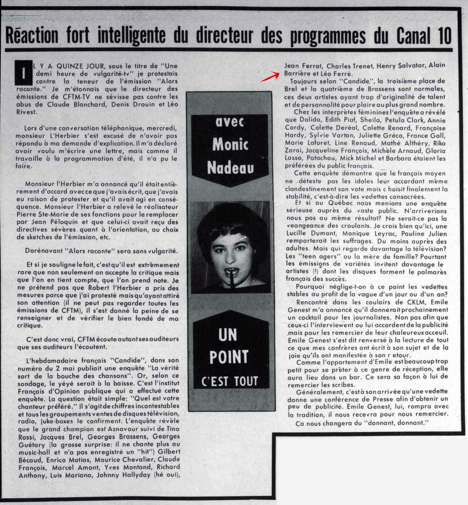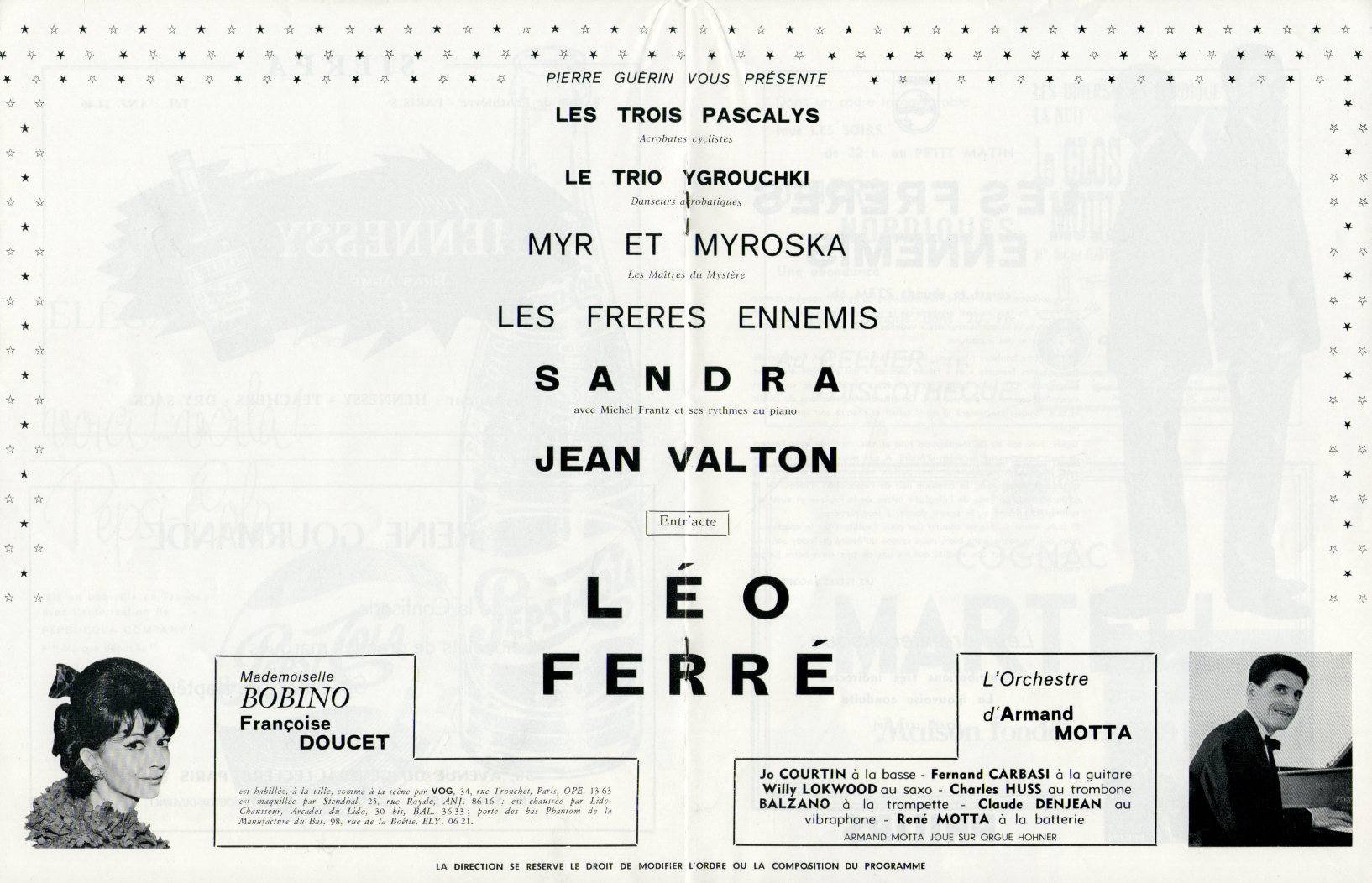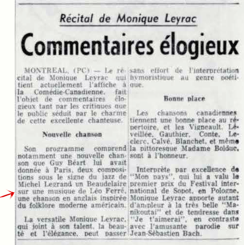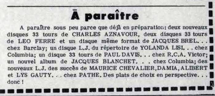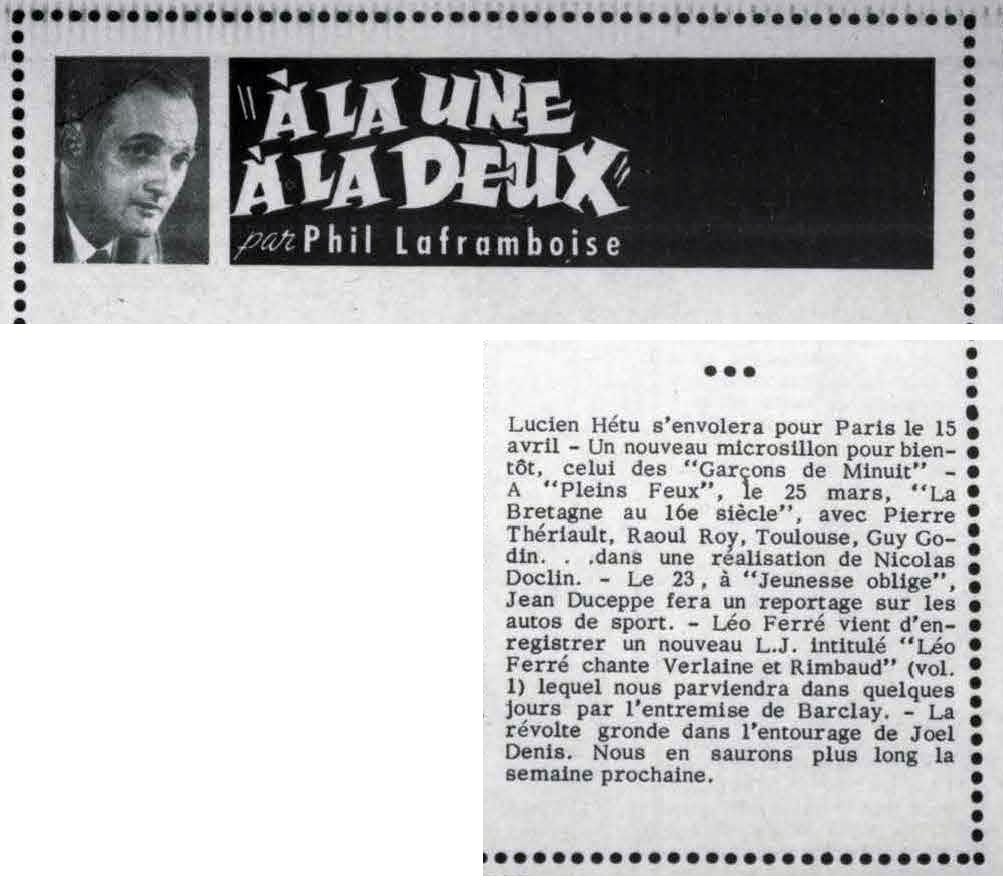 À partir du 17.03, Léo Ferré va remplacer au pied-levé Charles Trénet malade.