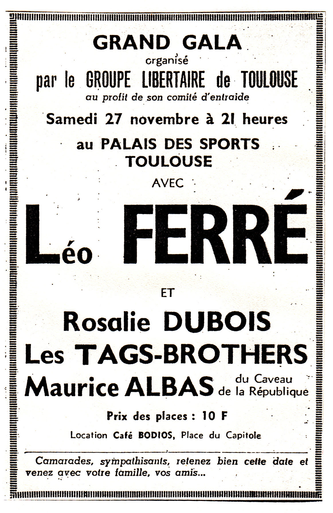 • Palais des Sports de Toulouse - Grand gala par le groupe libertaire de Toulouse - Samedi 27 novembre