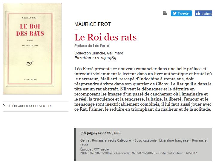 Préface du livre Le Roi des rats de Maurice Frot publié par Gallimard qui paraîtra le 10 septemre 1965.
