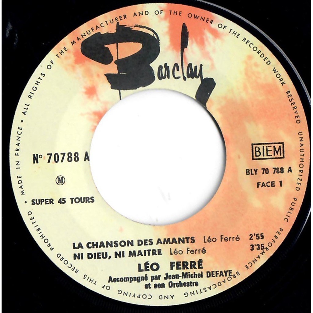 Enregistrement chez Barclay d’un 45 T (Barclay 70 788M) comprenant La chanson des amants, Ni dieu ni maître, Monsieur Barclay, L’enfance