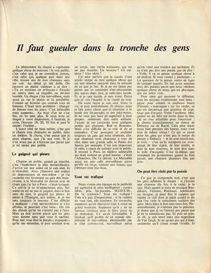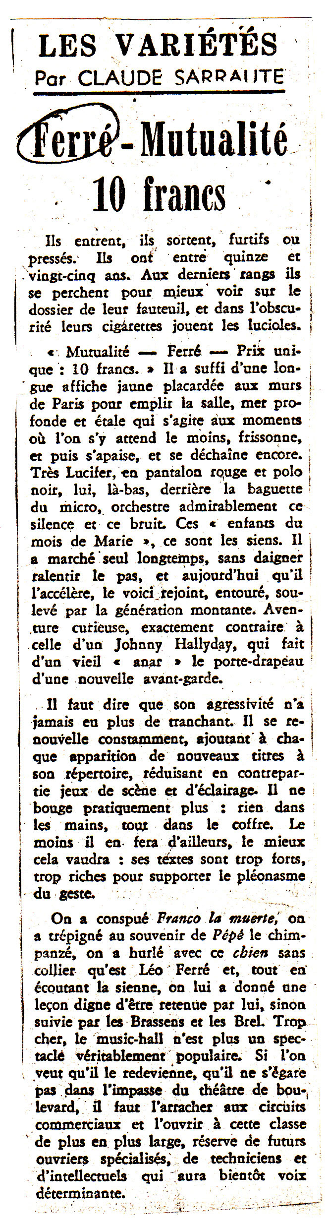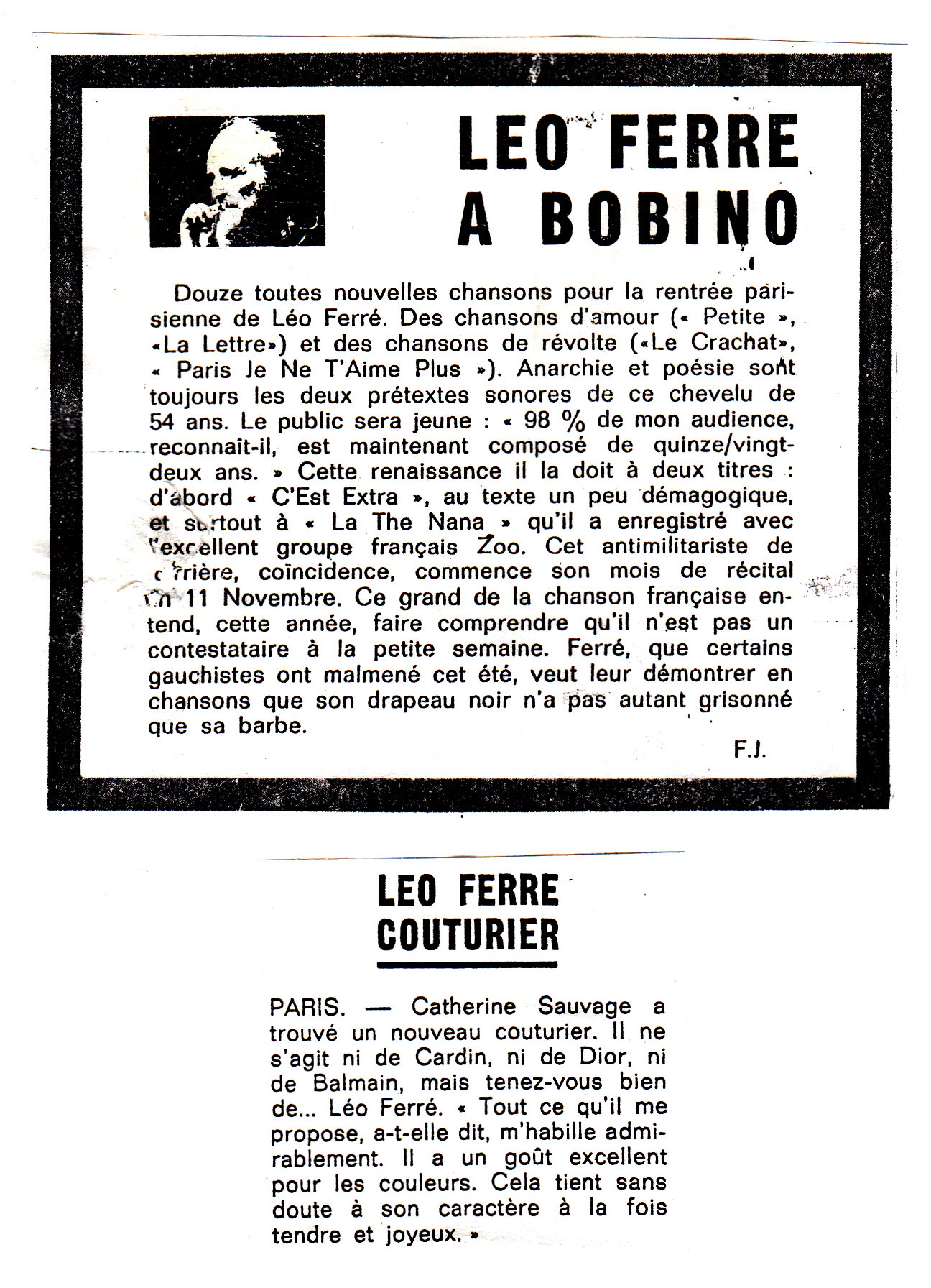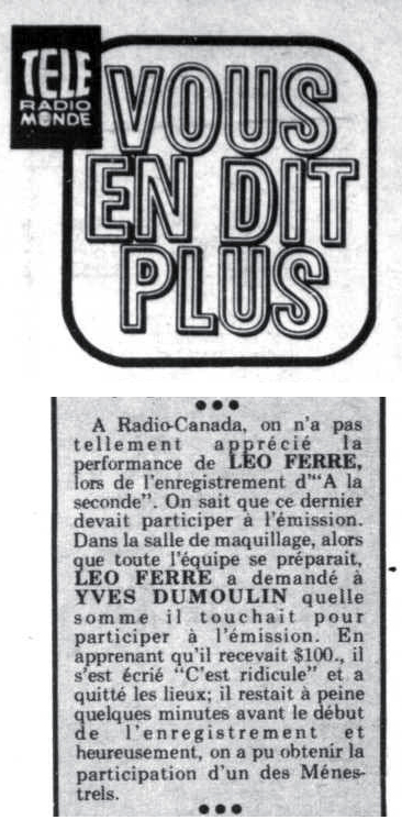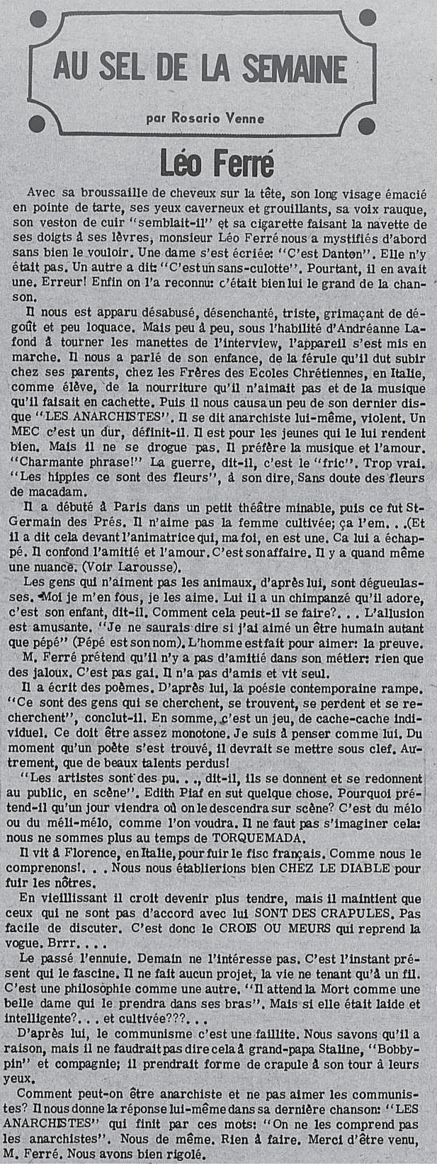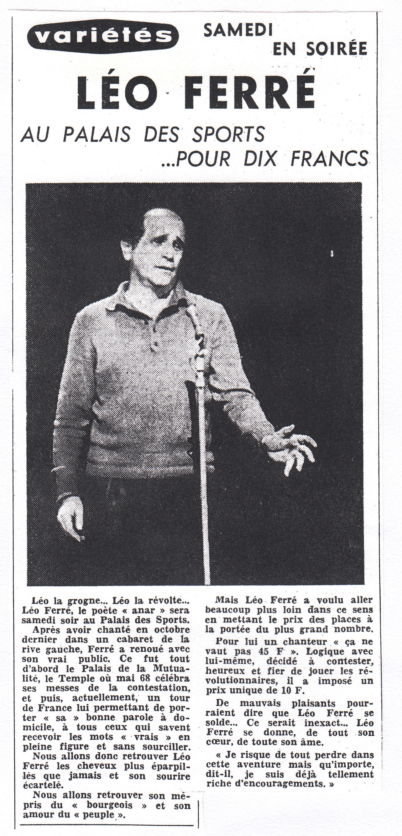 ITW Léo Ferré : "Cinq jours à la Mutualité - places tarif unique à 10 F, parce que places trop chères au music-hall, ainsi les gens qui n'ont pas beaucoup d'argent pourront venir.