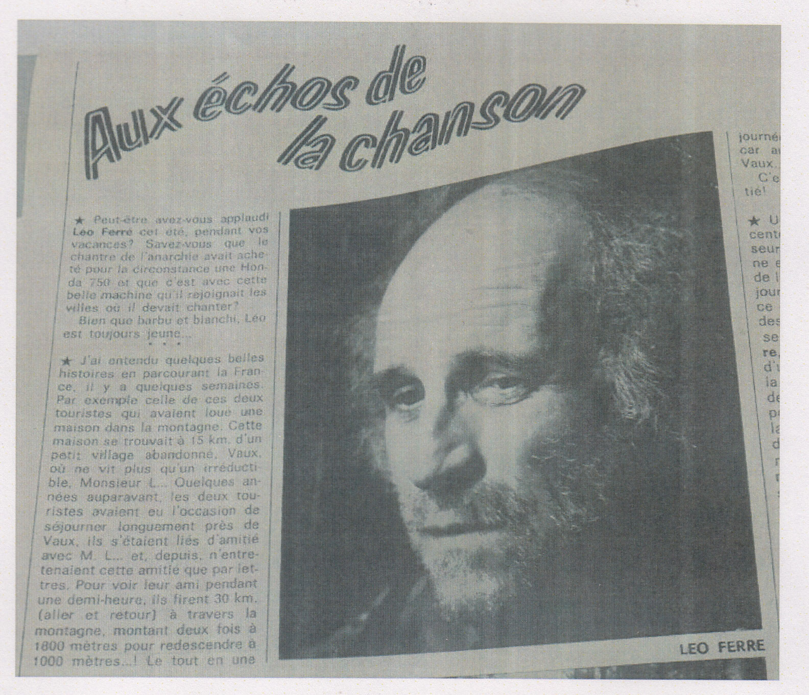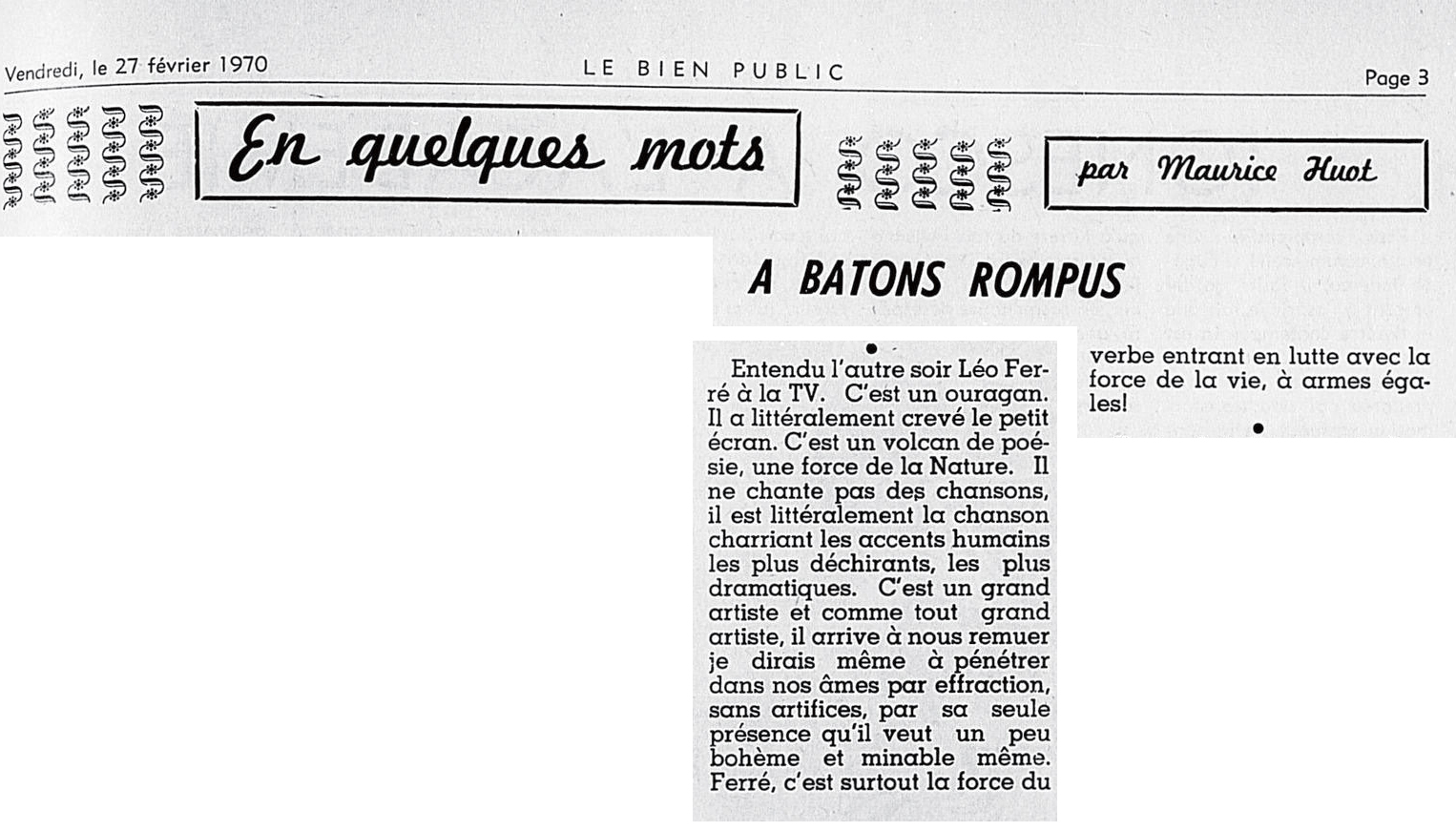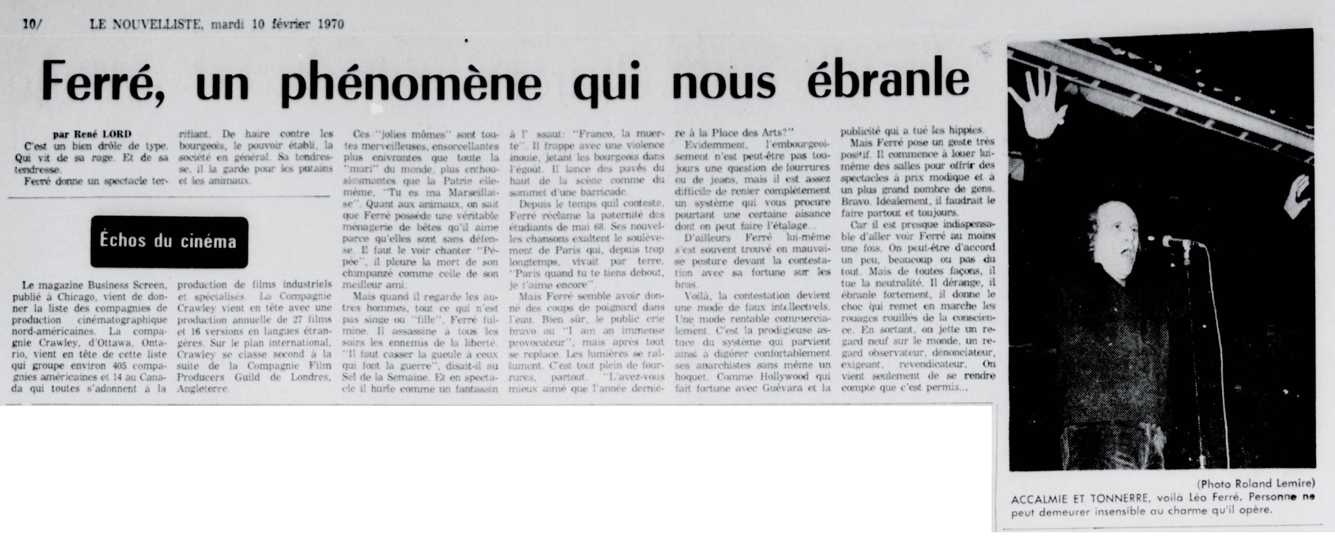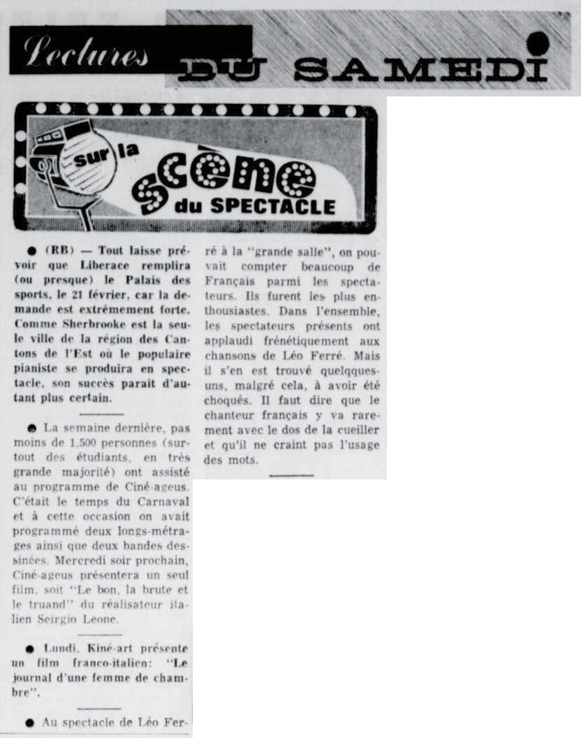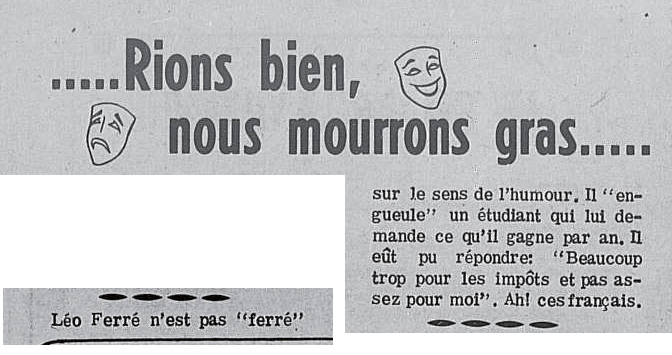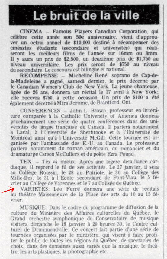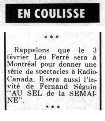 Toujours en janvier, les actualités Gaumont lui consacrent six minutes, sous le titre Un nouveau Léo Ferré.