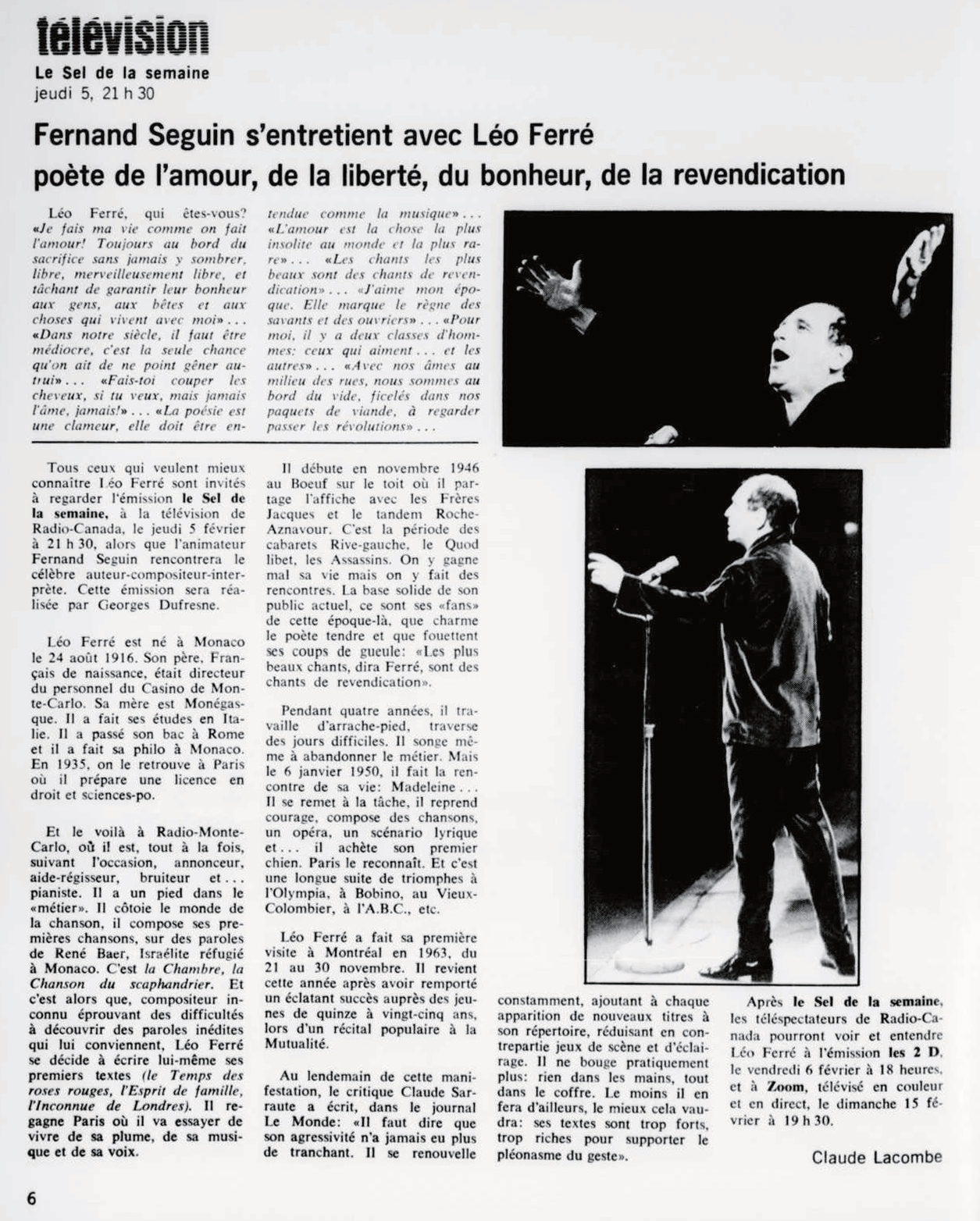 • Fernand Seguin s'entretient avec Léo Ferré poète de l'amour, de la liberté, du bonheur, de la revendication