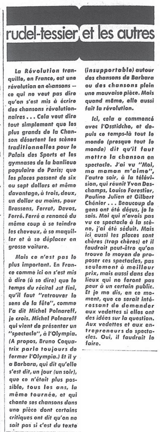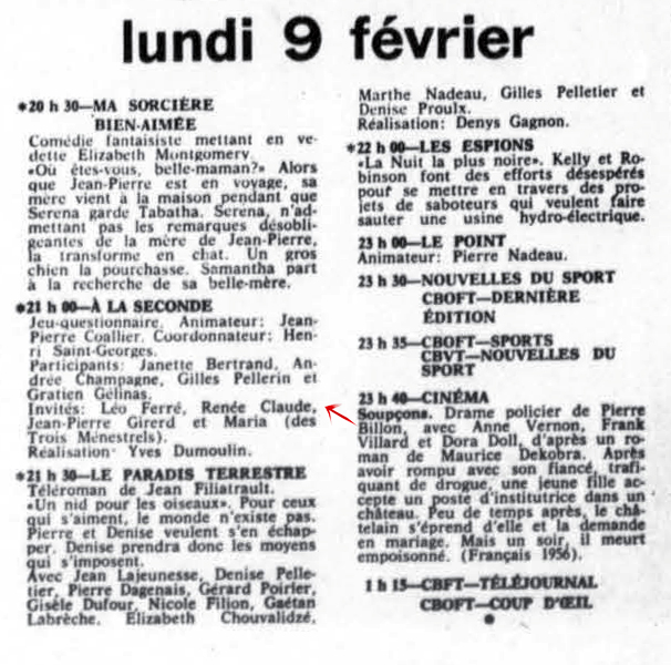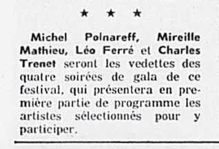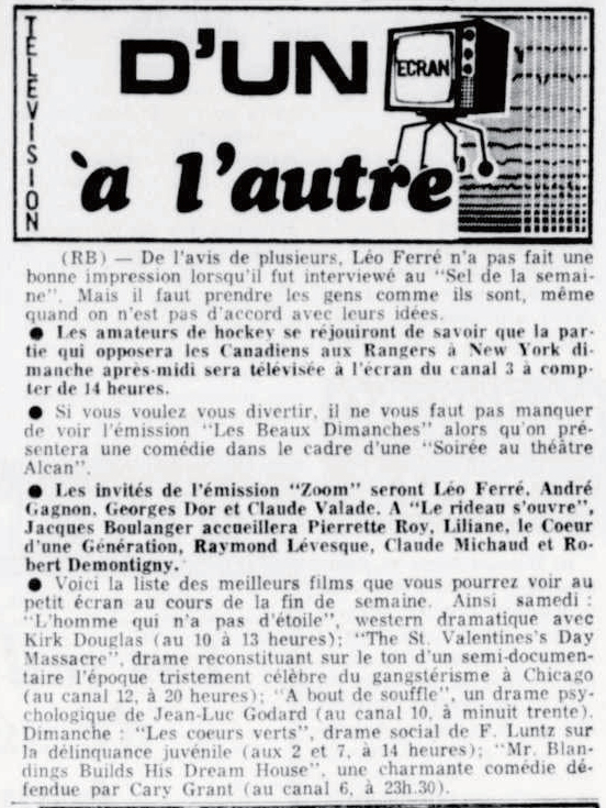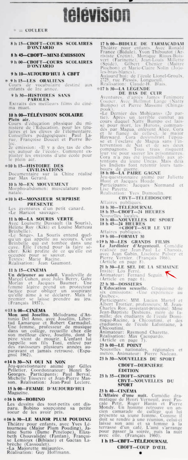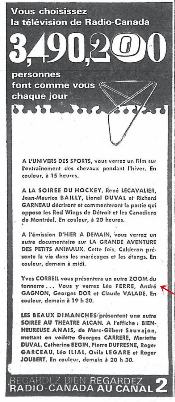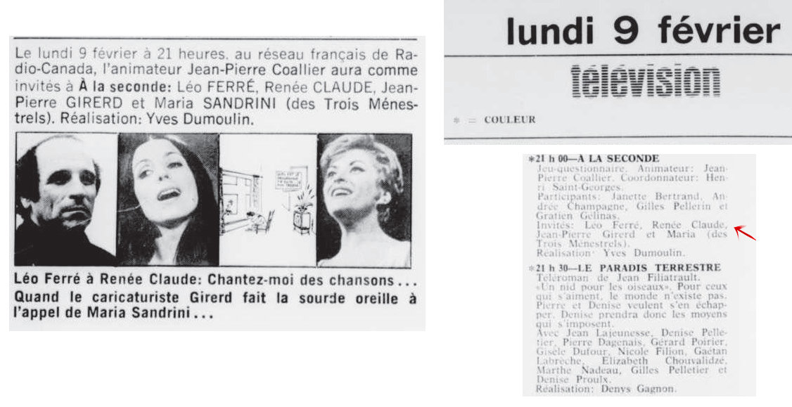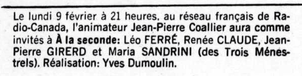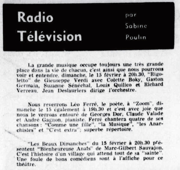 Le samedi 21, il passe à la télévision dans l’émission Samedi et compagnie où des extraits du récital à Bobino sont donnés.