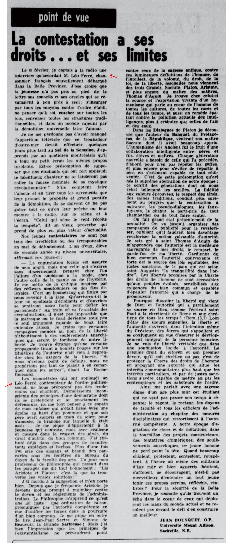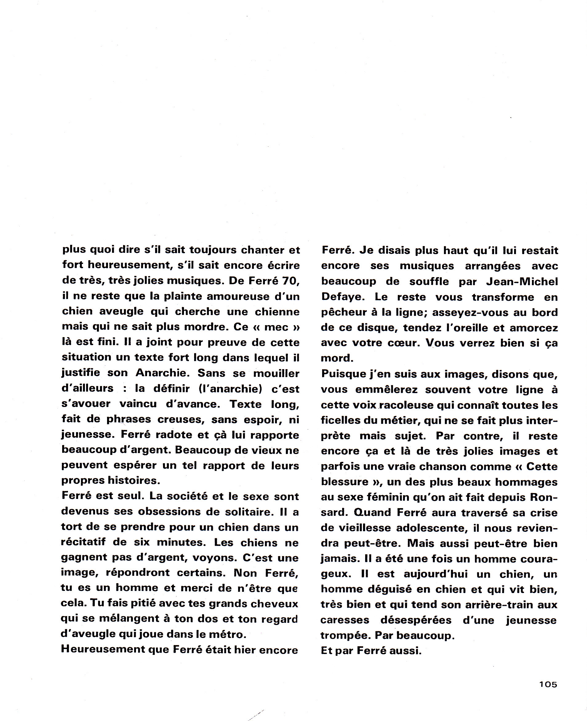 Au cours d’un Campus spécial « 30-40-50 » réunissant trois générations d’artistes, Ferré rencontre Claude Nougaro. Colère de Nougaro contre le tour de chant de Léo qu’il considère violent.