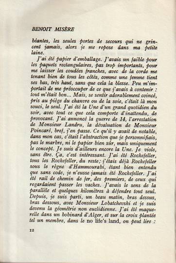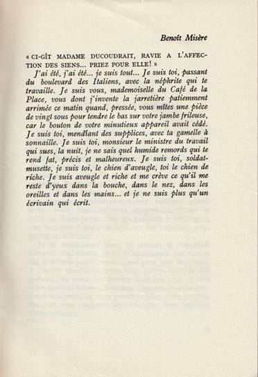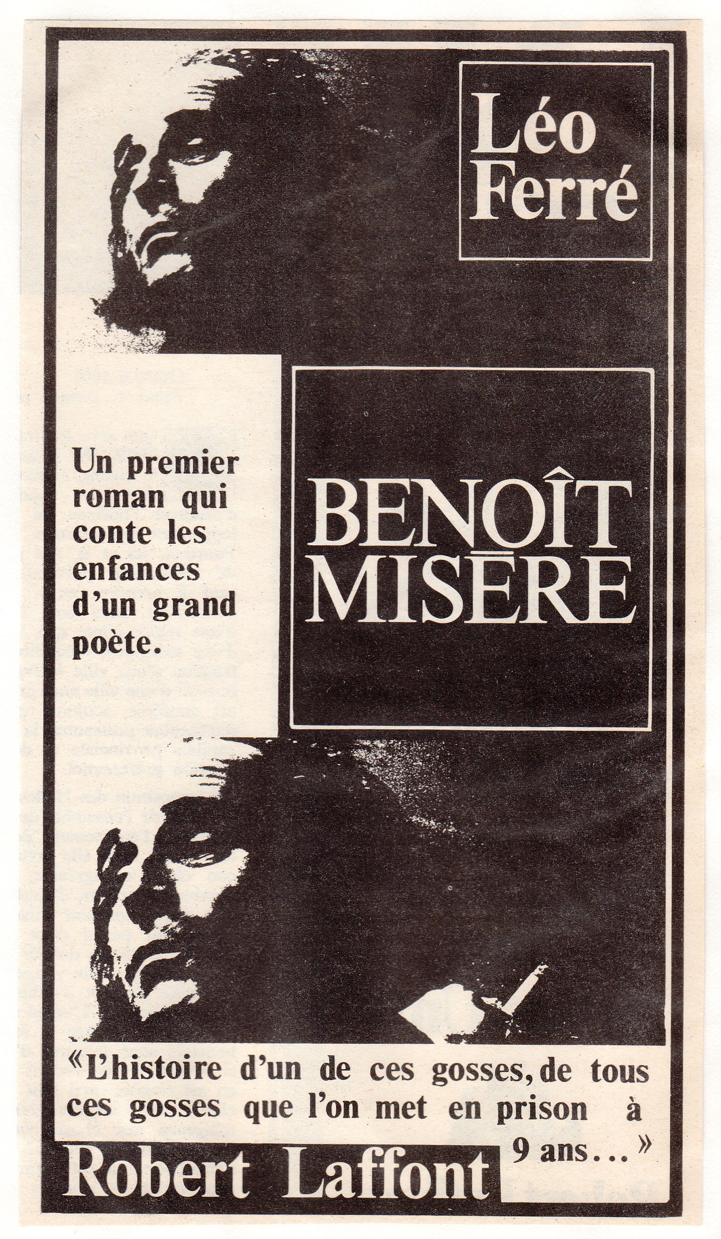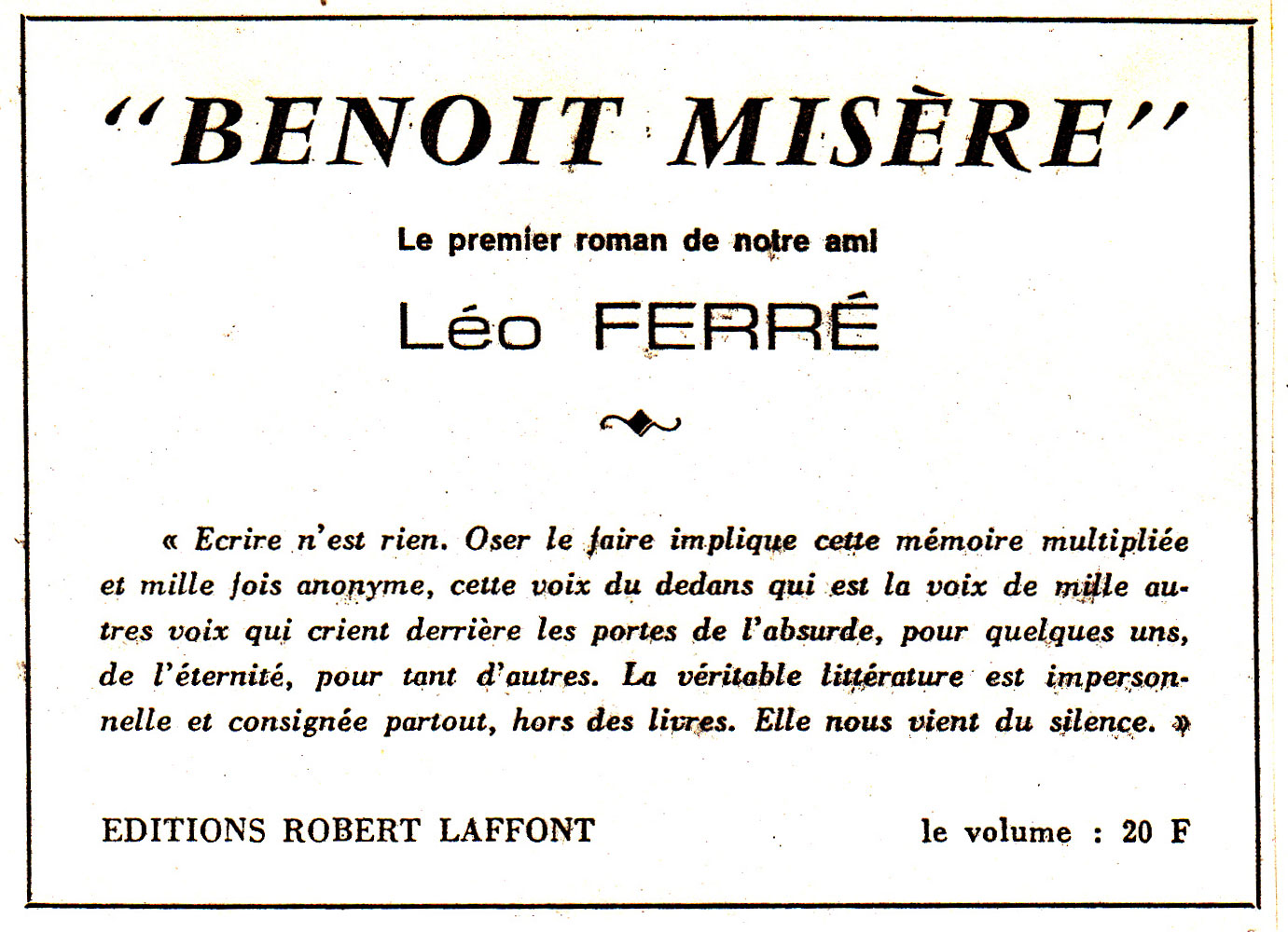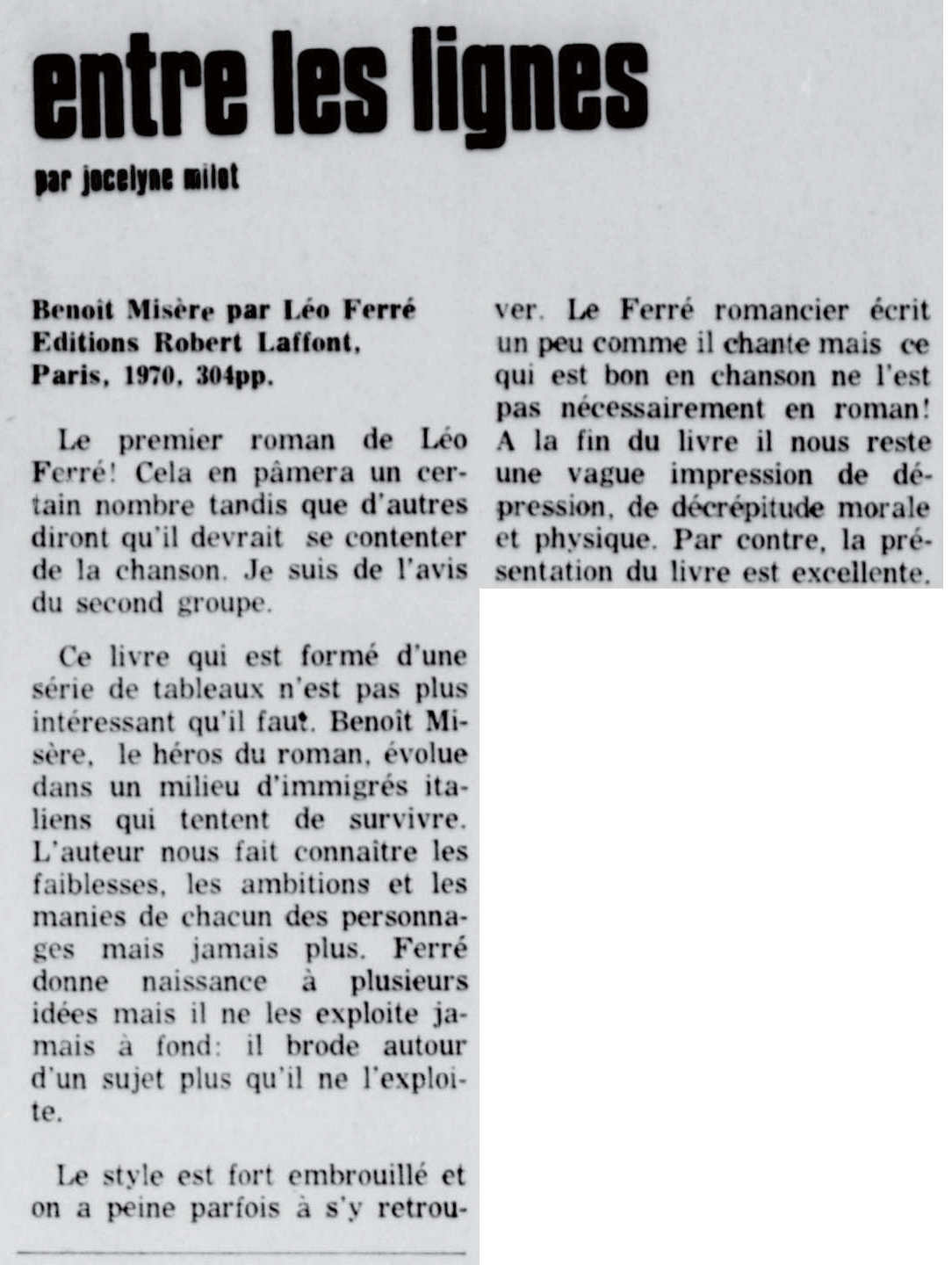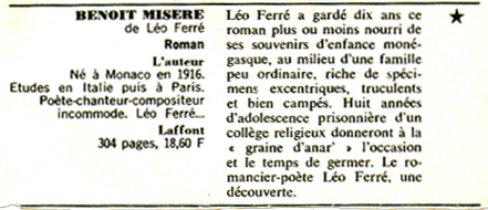 - Après avoir écouté les avis de quatre personnes présentes sur le plateau, Léo Ferré parle assez brièvement de son livre Benoit misère. Paul GuimardD résume ce 1er roman et Jean-Pierre Chabrol donne son point de vue. Léo Ferré est plus en verve lorsqu'il évoque le livre de son ami Jean-Pierre Chabrol.
