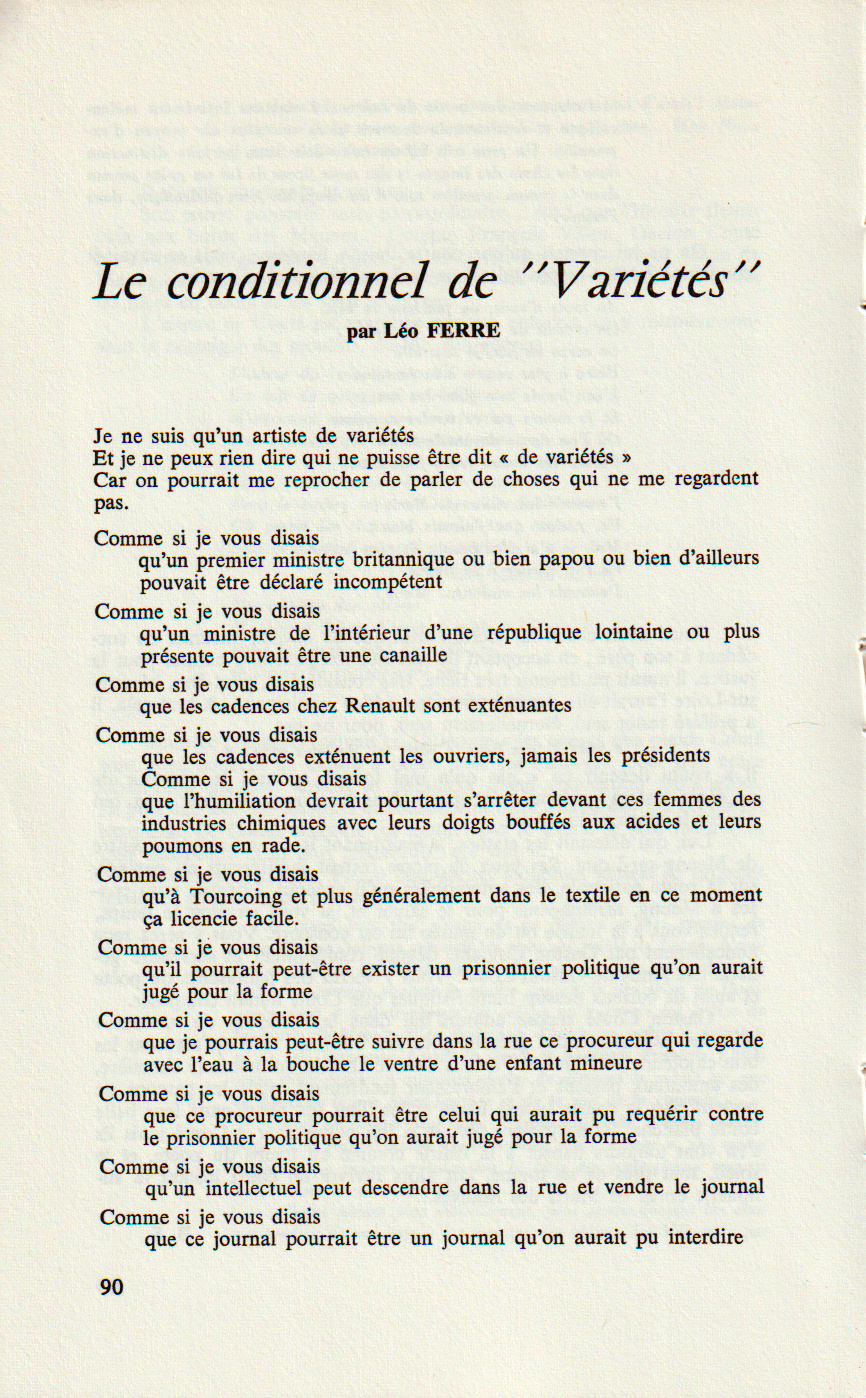 Le texte Le Conditionnel de variétés est donné dans La Rue, n° 9, au 4e trimestre. C’est Jean-Pierre Chabrol qui a trouvé ce titre.