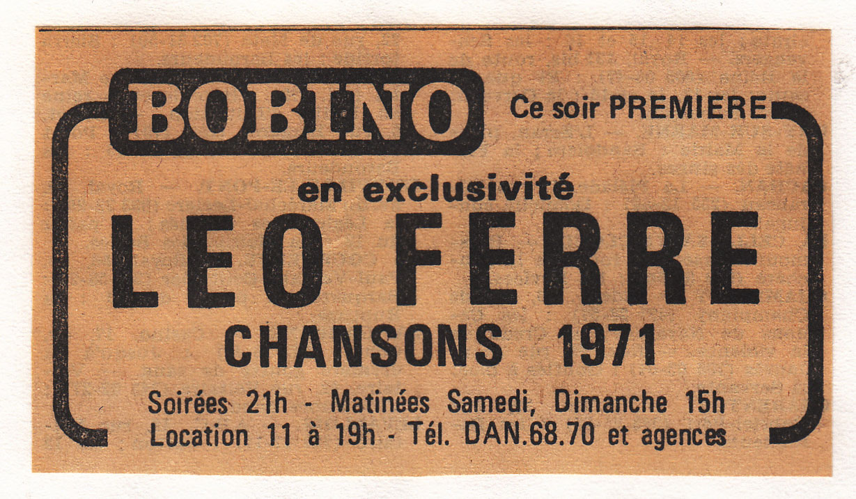 Du mercredi 11 novembre au mercredi 16 décembre, il passe à Bobino, au long de quarante-deux représentations qui ont lieu tous les soirs sauf le lundi à 21 h, le dimanche à 15 h. Ce sera la dernière fois car Félix Vitry, le directeur de la salle, mourra quelque temps après. Léo Ferré ne voudra pas continuer à chanter à Bobino après Vitry. Le programme vendu dans la salle comprend Demain. Lors de ce spectacle, il interprète Il y a, qu’il n’enregistrera jamais. Il est accompagné au piano par Paul Castanier.