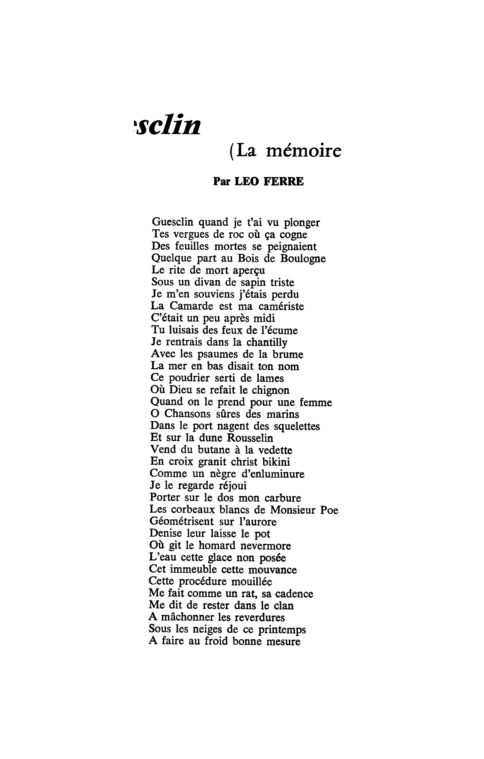 L'histoire commence avec l'achat par Ferré en 1959 d'une île à Saint-Coulomb en Bretagne. Le rocher s'appelle Guesclin, et c'est le nom que Ferré décide de donner au premier chapitre d'une oeuvre qu'il baptise les Chants de la fureur, et qu'il commence à écrire en 1960. Guesclin compte 55 strophes, 440 vers ! Pour La Mémoire et la Mer, Ferré va trancher, et ne garder "que" 10 strophes de 8 octosyllabes.