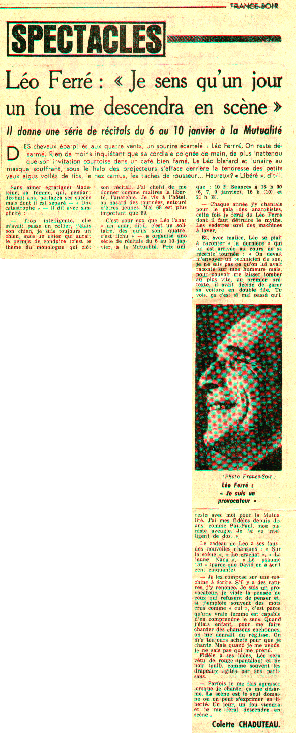 Léo Ferré : "Je sens qu'un jour un fou me descendra en scène"