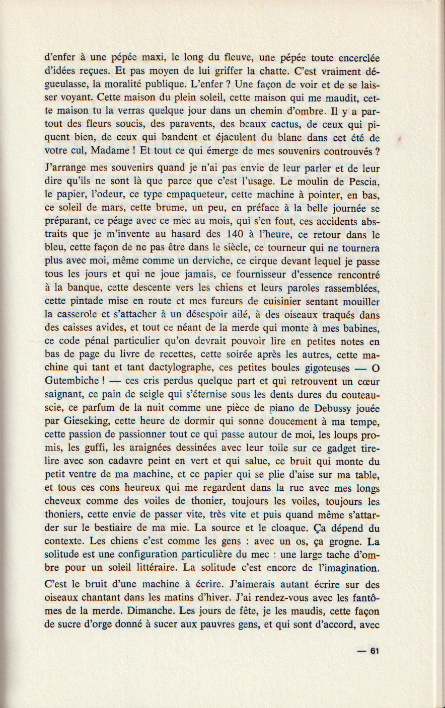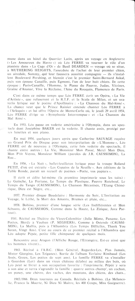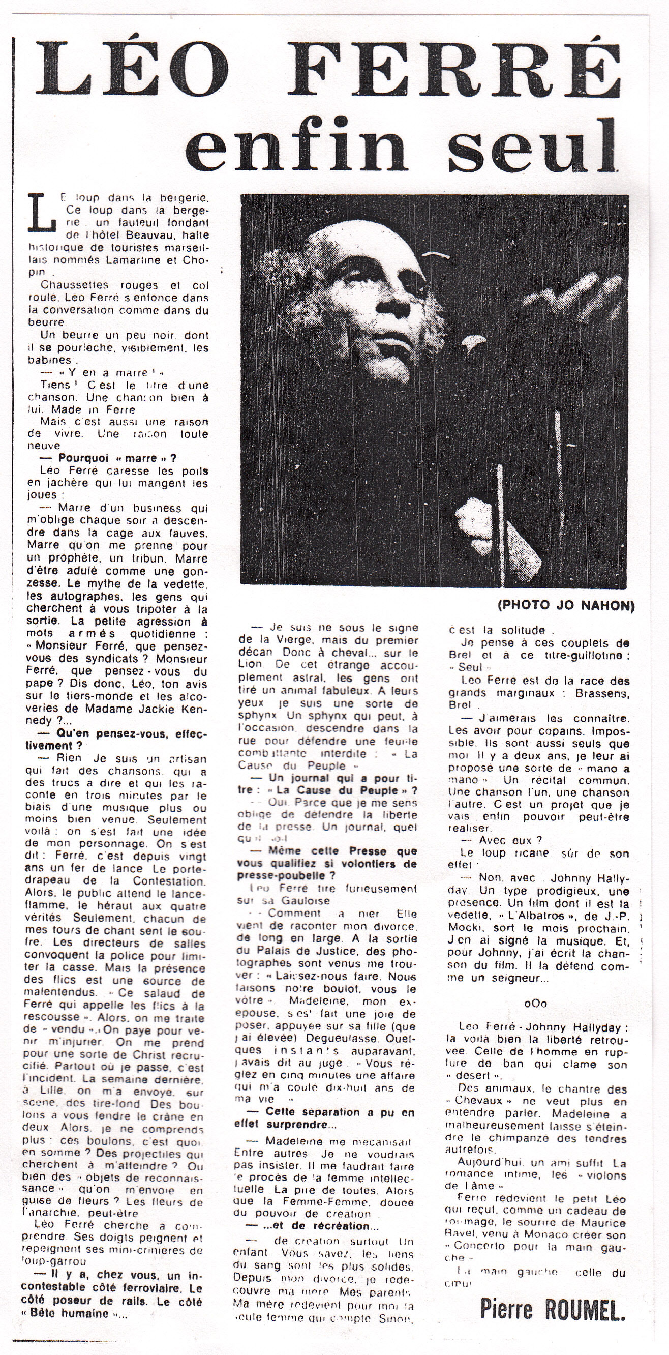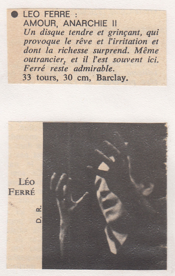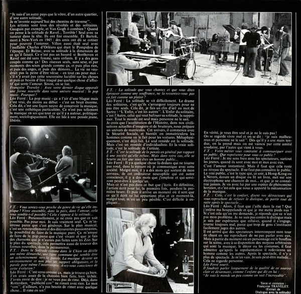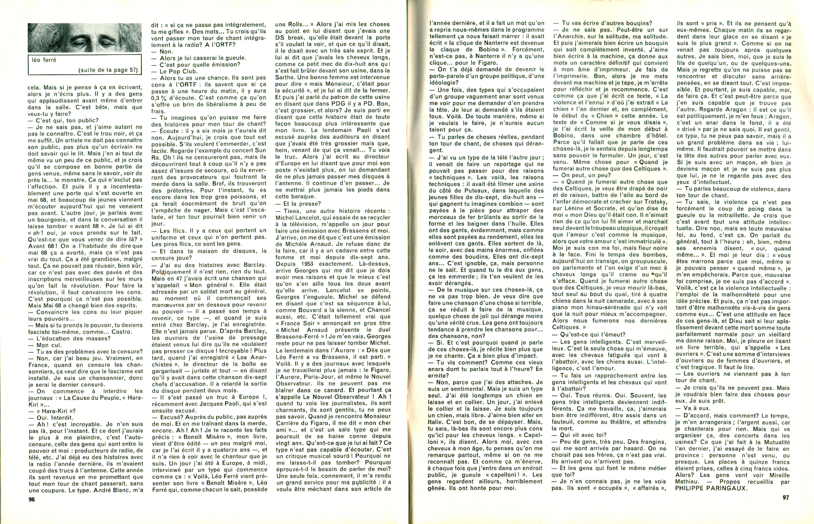 - INTERVIEW par Pierre Wiehn suite : Léo Ferré évoque : "L'amour et la musique, la plus belle drogue du monde" ; le bonheur : "En société le bonheur, que dalle!" ; la solitude ; l'argent (anecdote des places à la Mutualité à 10 francs) ; l'anarchie ; la révolution qu'il faut faire d'abord individuellement (anecdote sur un député de gauche dont Léo Ferré cite le nom mais qui a été rendu inaudible par le réalisateur : "la bourgeoisie jusqu'au bord des yeux") ; la bourgeoisie ; la liberté de la presse et sa chanson "La Cause du peuple" ; la nature ; Monaco ; l'internat chez les bons-pères ; la religion "je préfère le beaujolais fraternellement bu avec un copain..." ; Pépée son chimpanzé (il explique comment il l'a adoptée, l'a aimée et comment elle a été tuée) ; sa misanthropie ; sa misogynie (longue diatribe alternant son amour pour les femmes et sa détestation : il faut aimer les femmes mais savoir les mettre à leur place et quand on a fini de les adorer il faut qu'elles nous foutent la paix !... Il n'y a pas de génie chez les femmes... qu'elles n'emmerdent pas l'artiste !... Je hais certains femmes cultivées, il n'en rentre plus une chez moi !... Ce n'est pas assez intelligent, jamais !... L'intelligence des femmes c'est dans les ovaires ! Les femmes c'est la mère !... il y a des femmes qui sont de grandes salopes et y'en a d'autres qui sont adorables... On est baisé parce qu'on en a besoin...".