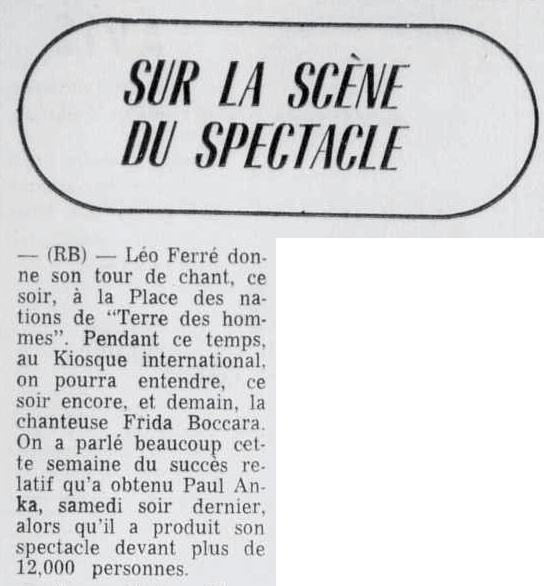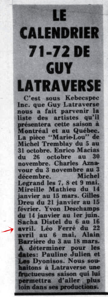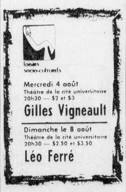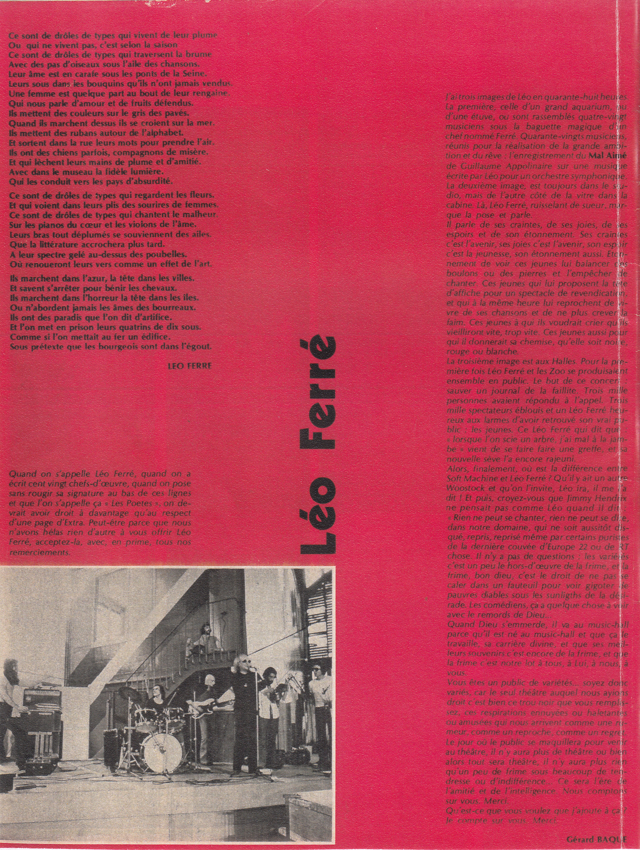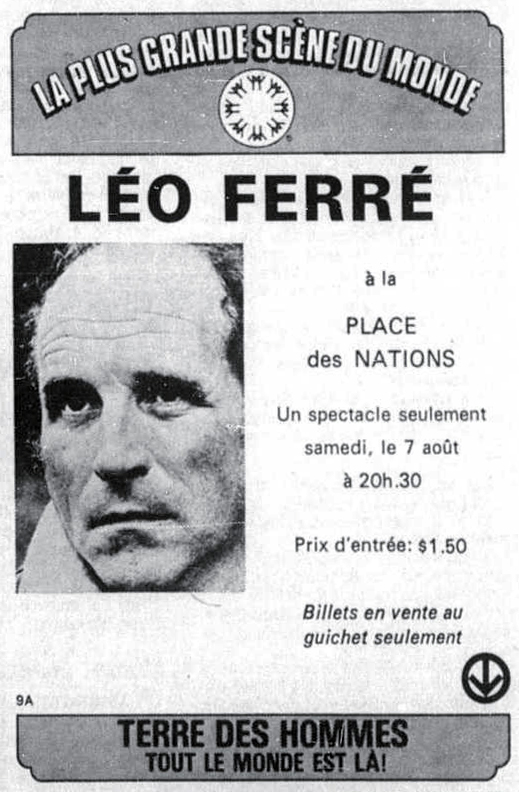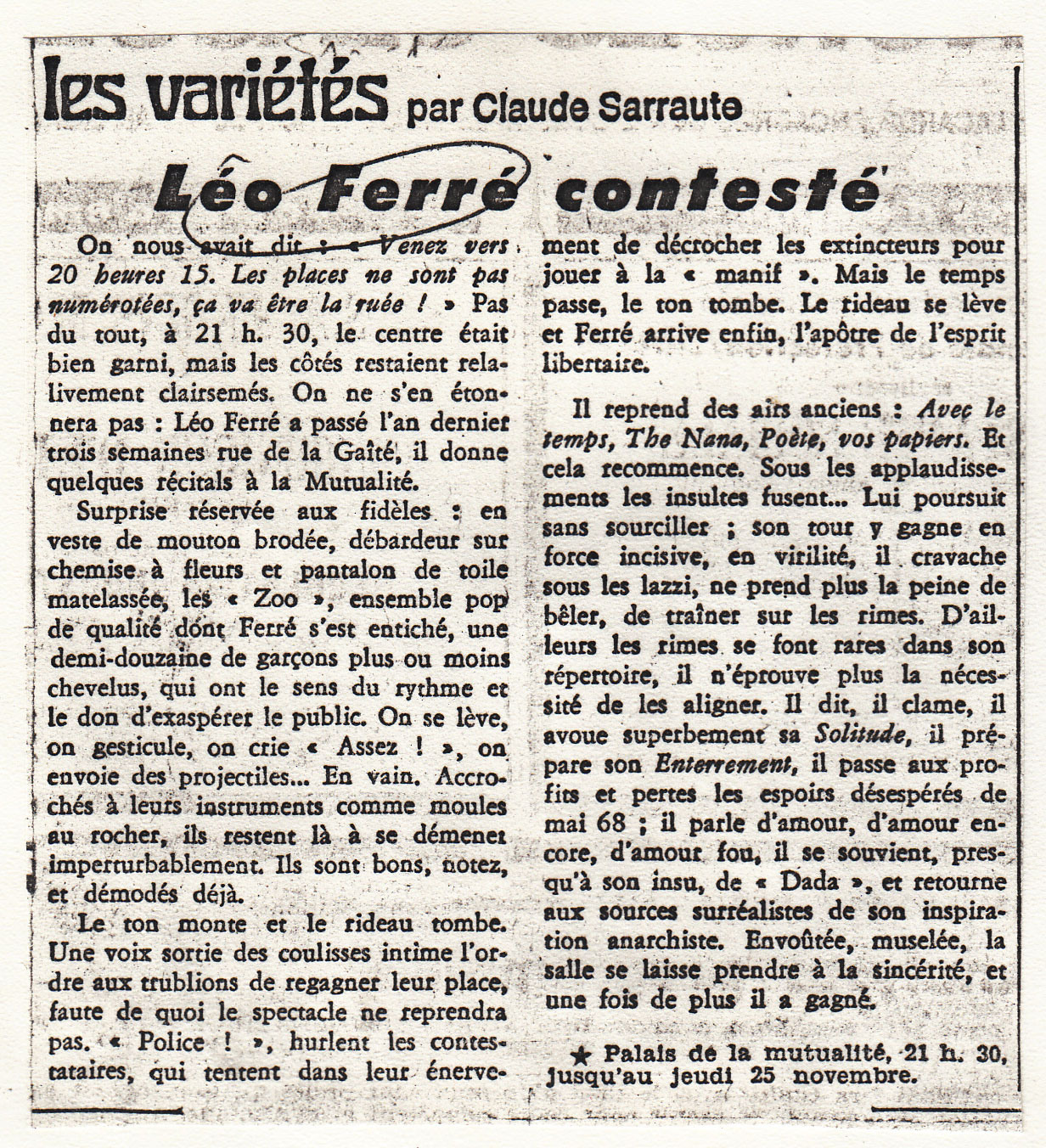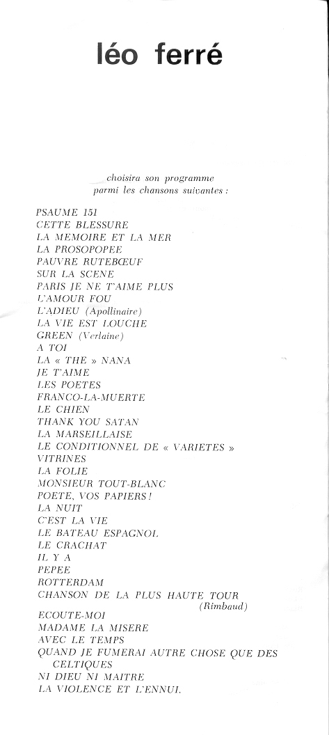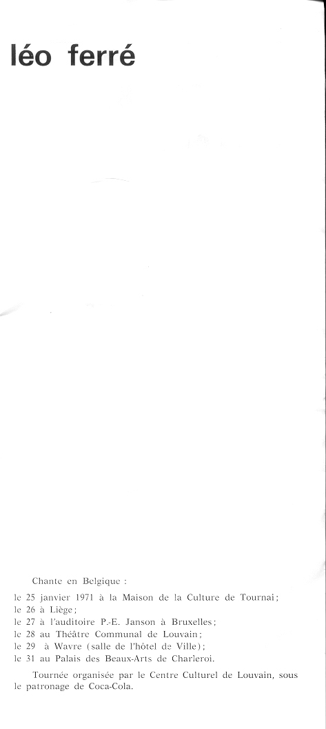 Le samedi 14, Ferré se produit au Centre culturel de Seraing (Belgique).