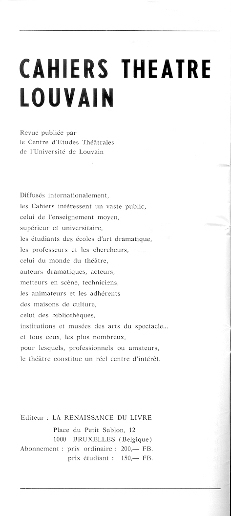 Revue publiée par le Centre d'Ètude théâtrales de l'Université de Louvain